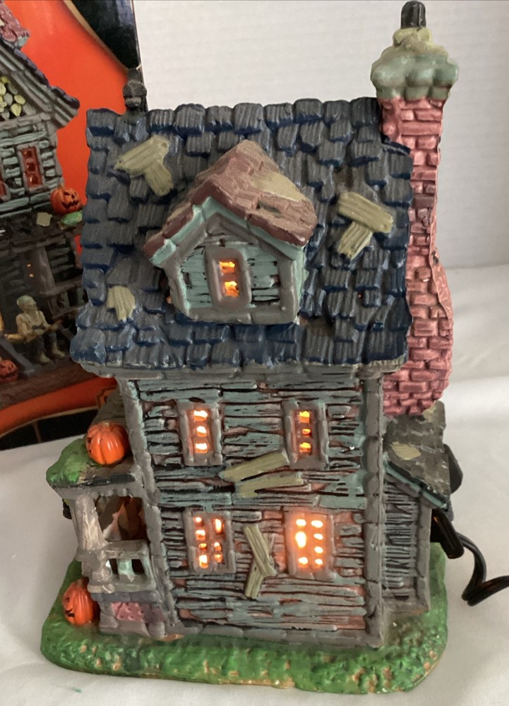 The Lemax Spookytown Creepy Neighborhood House is a ceramic and porcelain lighted building from the Spooky Town collection. Released in 2017, this retired Halloween-themed piece features a haunted house design suitable for seasonal displays. Part of the Lighted Buildings series, it illuminates to create a spooky ambiance for Halloween decorations. This collectible item captures the essence of a creepy neighborhood setting, making it a unique addition to any village or house display for enthusiasts of holiday and seasonal decor.