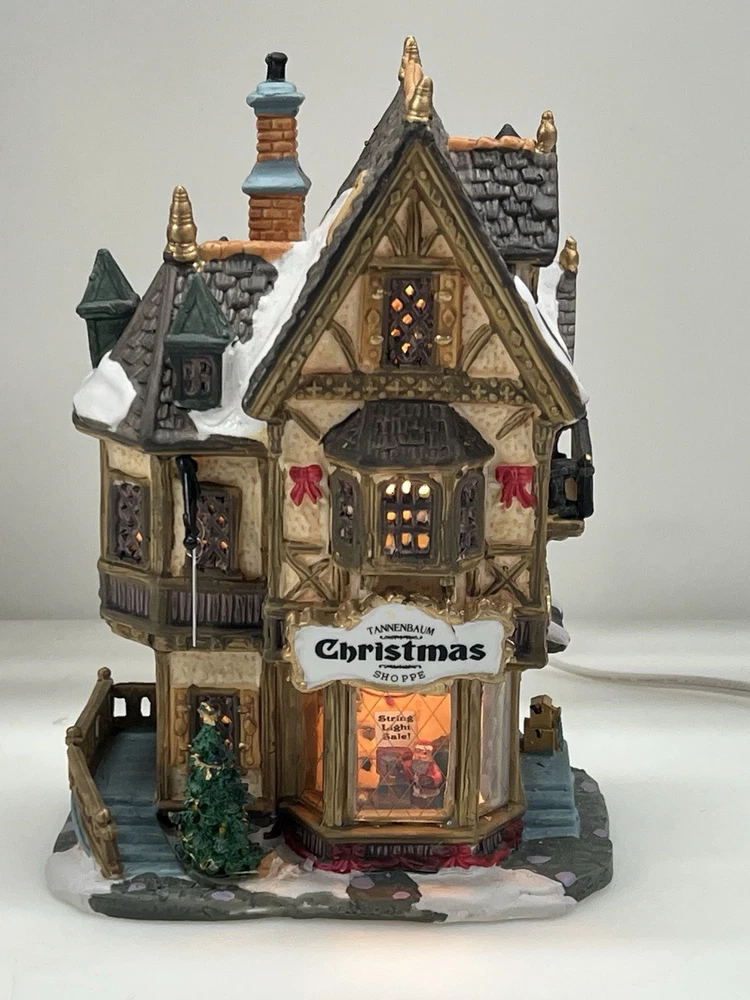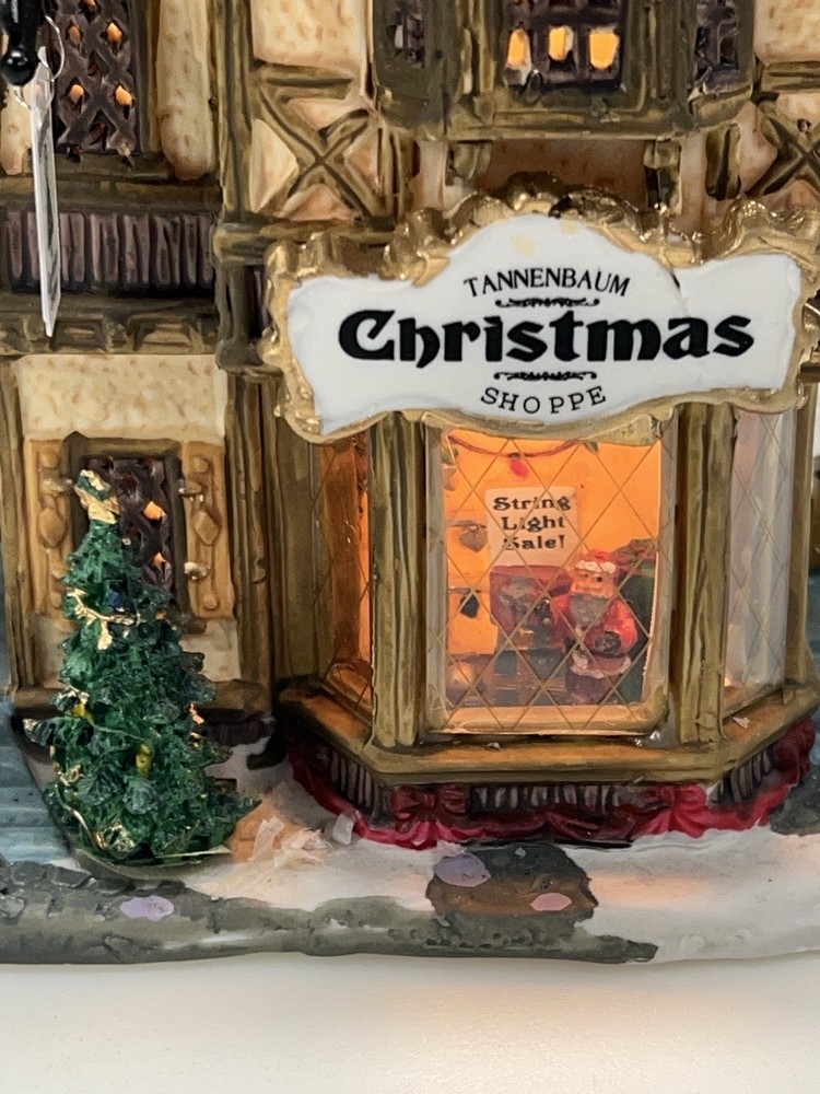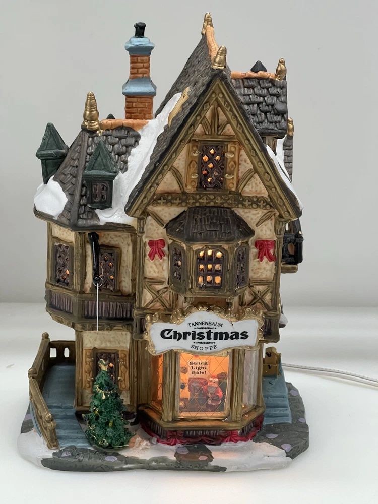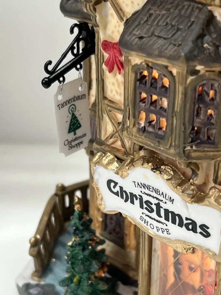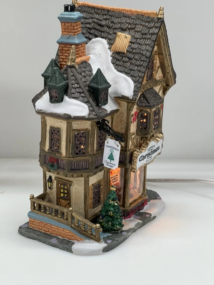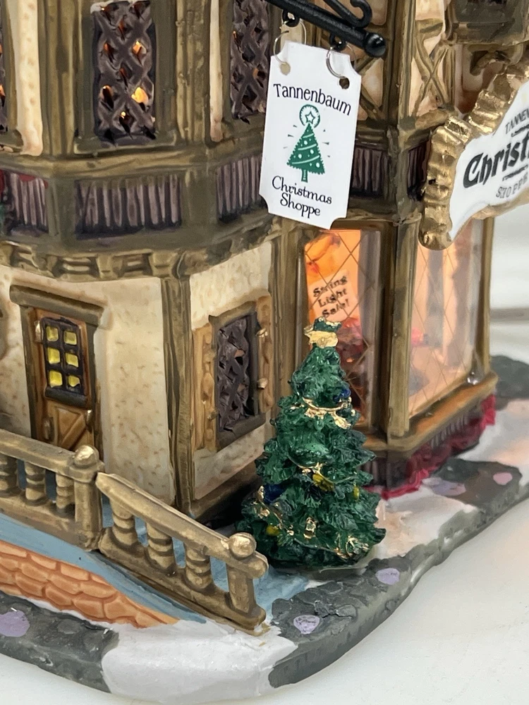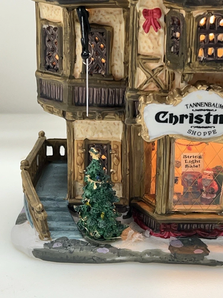 This is a rare and sought-after Lemax Christmas Village piece from the Carillon Decorative Products collection. The Tannenbaum Christmas Shoppe, manufactured in 2003, is a beautiful and intricate porcelain asymmetrical building with a whimsical pattern and multicolor finish. It measures 6 inches in length, 8-1/2 inches in height, and 4 inches in width and comes boxed with a light for easy display in any room. This piece is perfect for collectors of Christmas Shoppe-themed items and those looking to add a touch of Victorian style to their holiday decor. Absolutely incredible detail, design & color ! Perfect pristine condition! Includes all original packaging including cord & light !