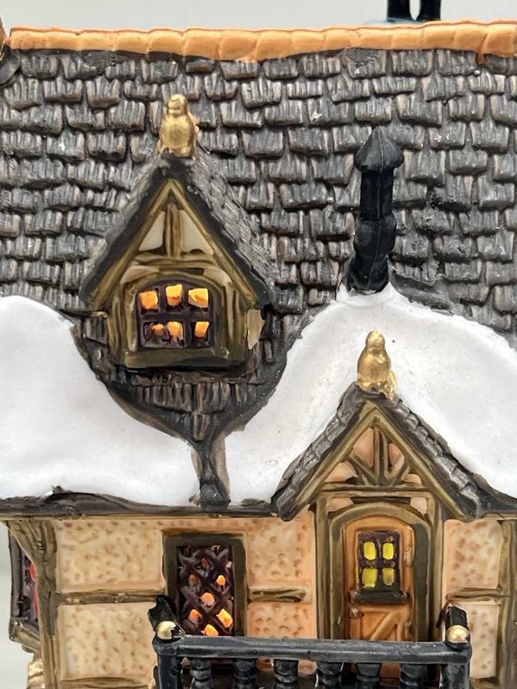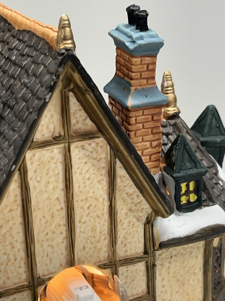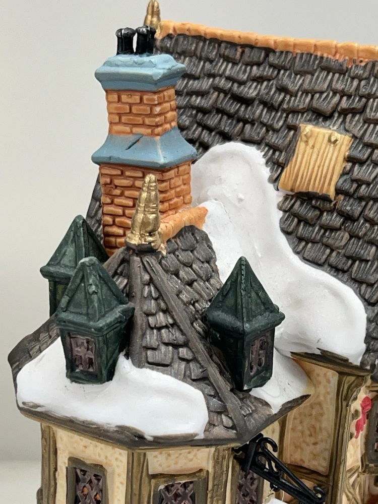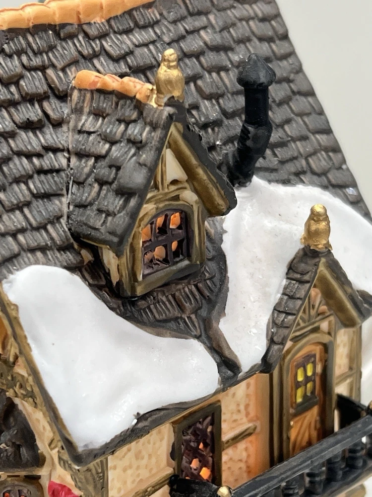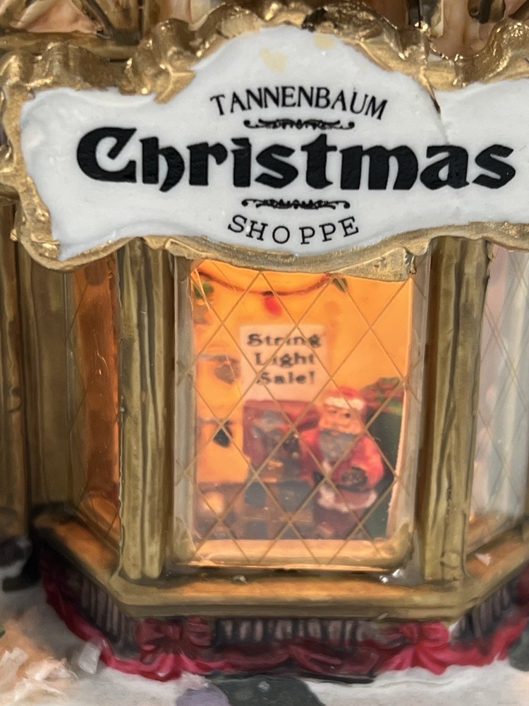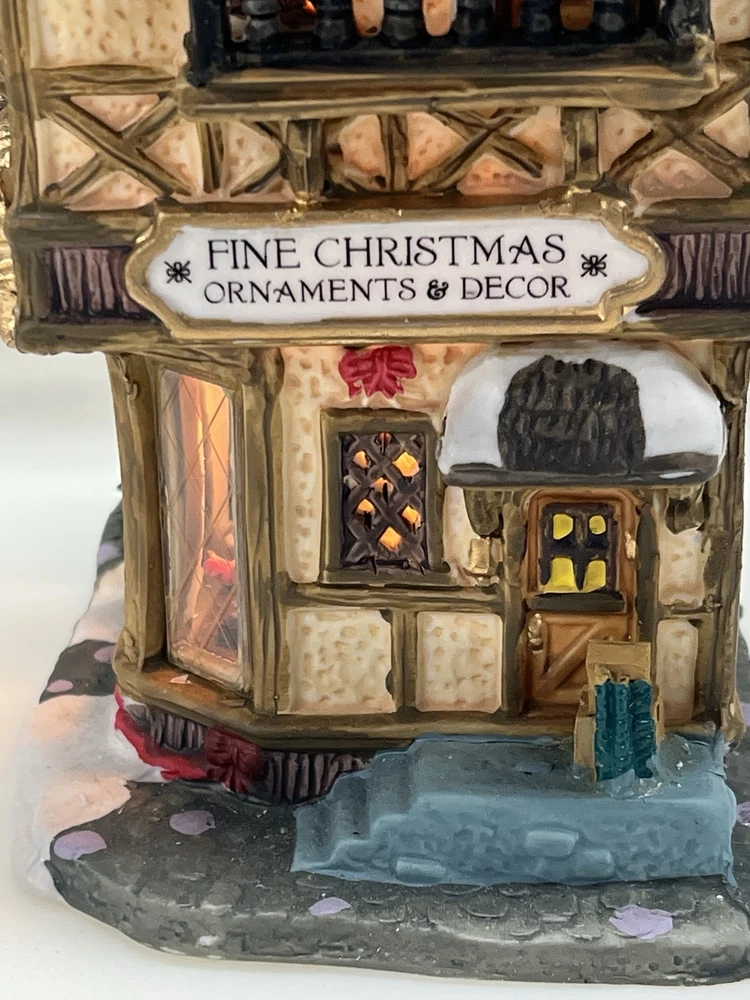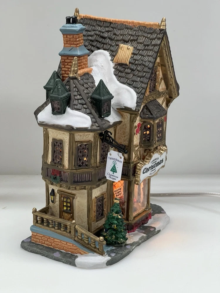 This is a rare and sought-after Lemax Christmas Village piece from the Carillon Decorative Products collection. The Tannenbaum Christmas Shoppe, manufactured in 2003, is a beautiful and intricate porcelain asymmetrical building with a whimsical pattern and multicolor finish. It measures 6 inches in length, 8-1/2 inches in height, and 4 inches in width and comes boxed with a light for easy display in any room. This piece is perfect for collectors of Christmas Shoppe-themed items and those looking to add a touch of Victorian style to their holiday decor. Absolutely incredible detail, design & color ! Perfect pristine condition! Includes all original packaging including cord & light !