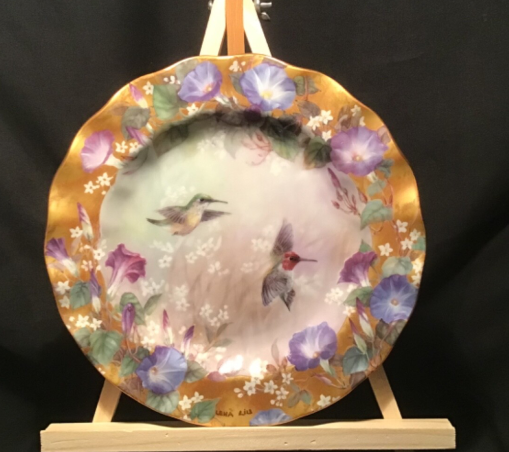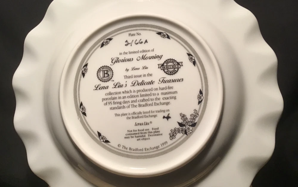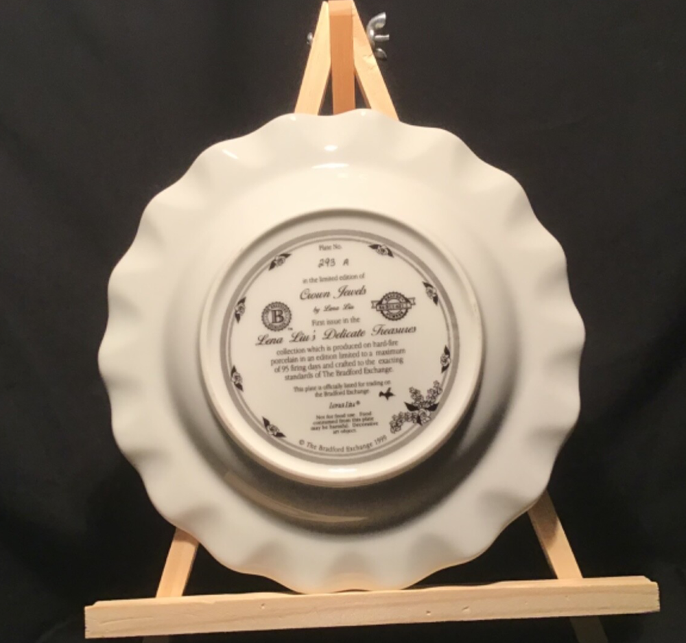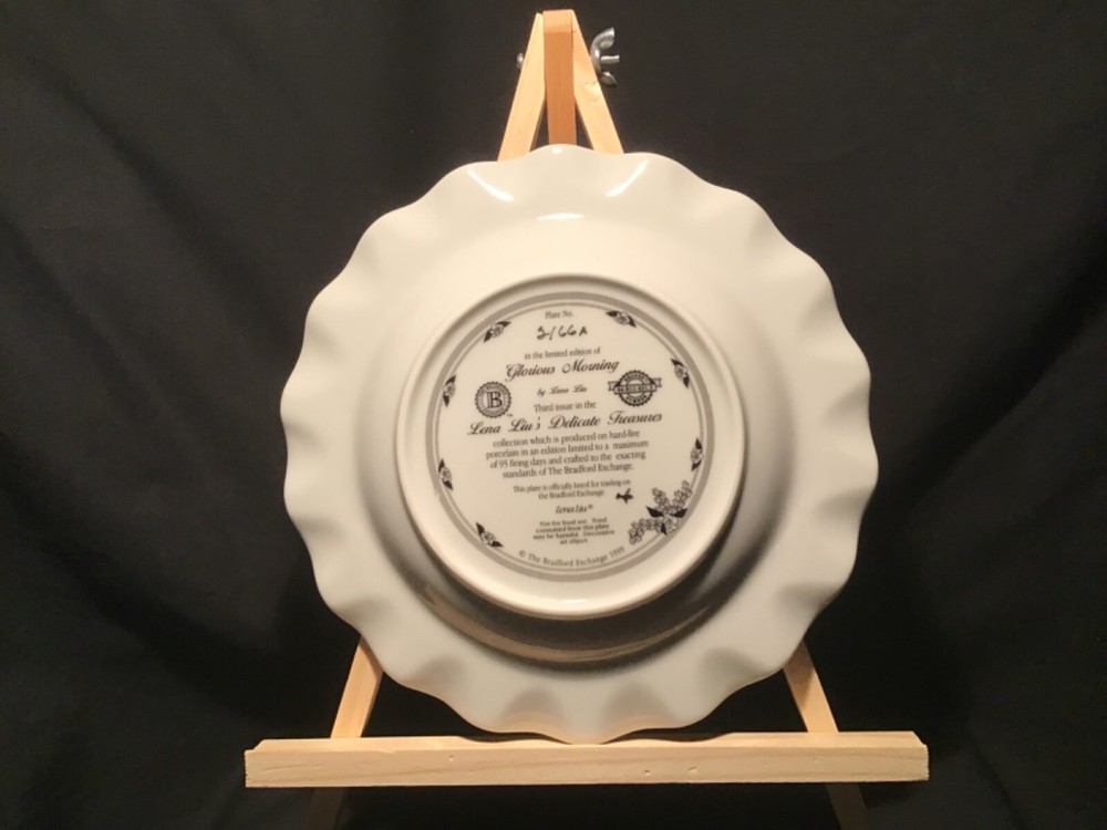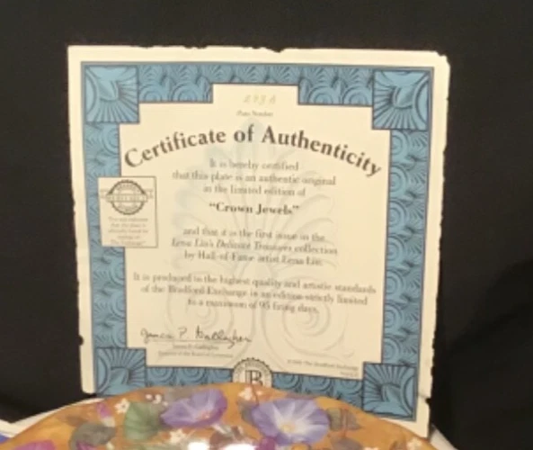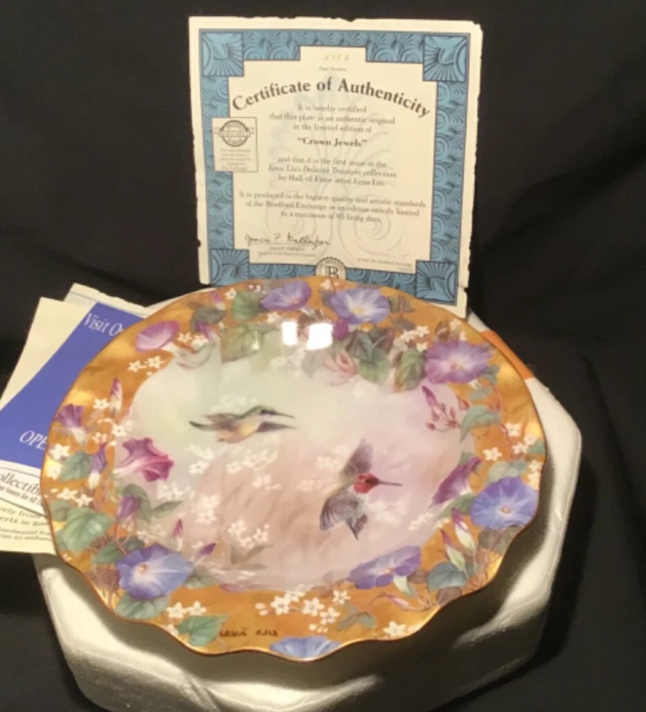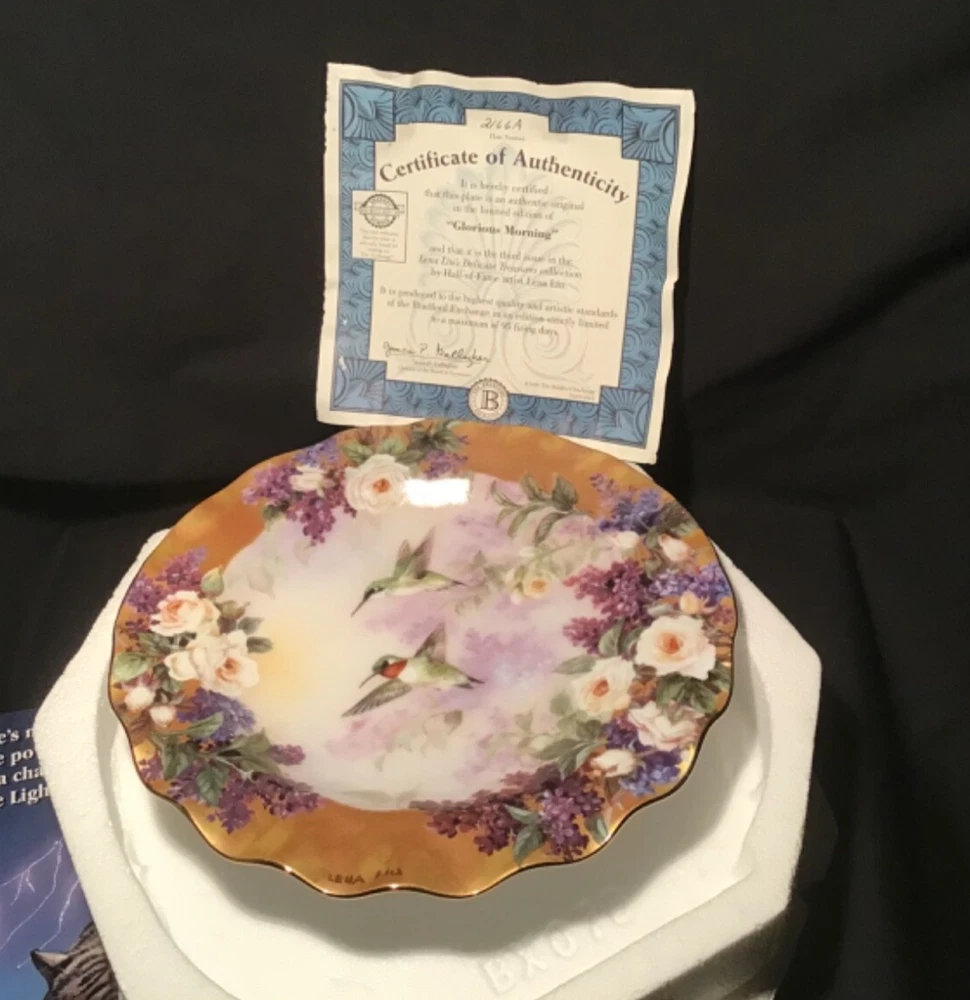 This collector plate set by Bradford Exchange features two beautiful designs by Lena Liu, titled "Crown Jewels" and "Glorious Morning". The plates have a round shape with an 8 inch diameter and are made of fine porcelain. The floral pattern and multicolor palette make them perfect for all occasions, while the bird theme adds a touch of nature to your collection. These vintage plates were produced in the late 20th century using art pottery techniques, and are part of the Delicate Treasures series. They are perfect for decorative purposes or for collectors of fine porcelain plates. Add them to your collection today! These come in original foam packing and certificates Also one certificate is a little beat up on edges