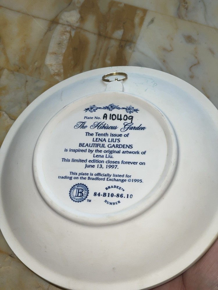 Lena Liu's Beautiful Garden by BRADFORD EXCHANGE the hibiscus garden 1994 is a vintage collector plate/3D sculpture made of ceramic, A10409 measuring 7 inches in diameter. This decorative piece features a multicolor design of hibiscus flowers and butterflies, reflecting the American culture of the late 20th century. The art pottery production style adds a unique touch to this intricate and detailed piece, making it a perfect addition to any collector's display for all occasions.