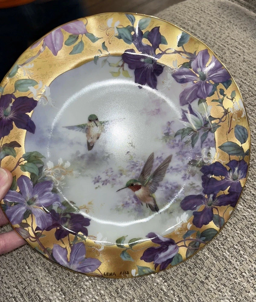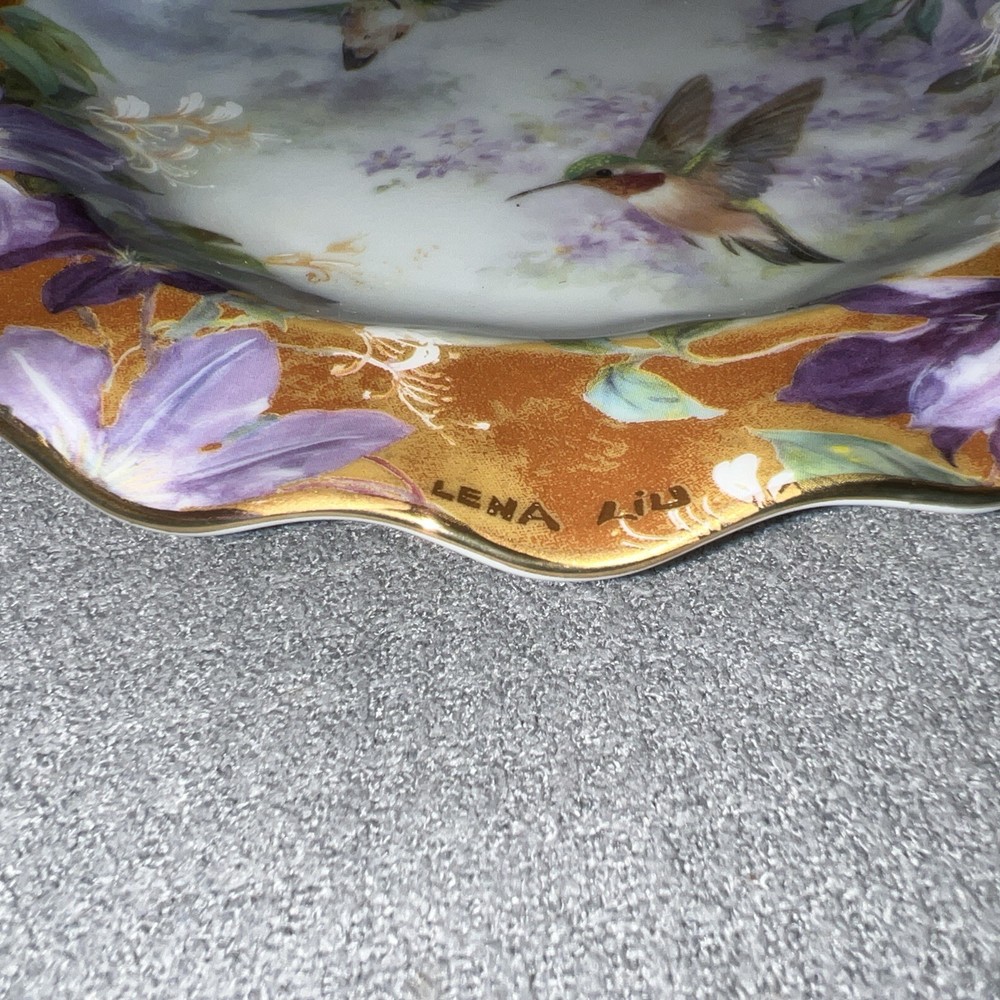 Plate no. 3685A in the limited edition of Ruby Splendor by Lena Liu, this exquisite Crown Jewels Hummingbirds Lilac Floral Plate is a testament to the artistry of the late 20th century. Part of the esteemed Bradford Exchange collection, "Lena Liu’s Delicate Treasures," this collector's item features a vibrant multicolored floral pattern with delicate hummingbird details, embodying the elegance of American art pottery tradition. The porcelain plate measures 8 1/8 inches in diameter, perfectly round, and is suitable for display on any occasion. Rooted in a rich culture of craftsmanship, this piece combines the timeless appeal of decorative style with the skilled pottery techniques of the 1990 era. It is a true vintage gem for both enthusiasts and discerning collectors alike.