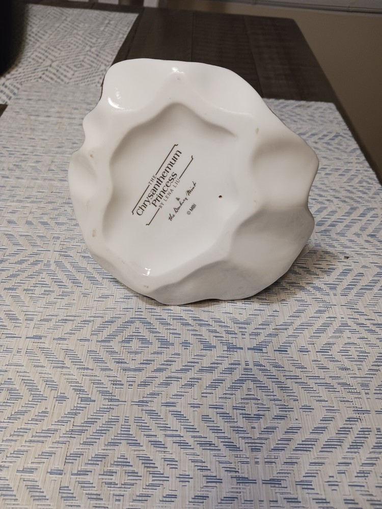 Add a touch of elegance to your collection with this beautiful Danbury Mint porcelain figurine titled "The Chrysanthemum Princess" by Lena Liu. This exquisite piece features intricate details and is made of high-quality porcelain, making it a perfect addition to any decorative collection. The princess is depicted in a stunning chrysanthemum flower dress, with a crown of gold and accents. This figurine is a true gem for collectors and enthusiasts alike, and is sure to be a conversation starter in any room.
