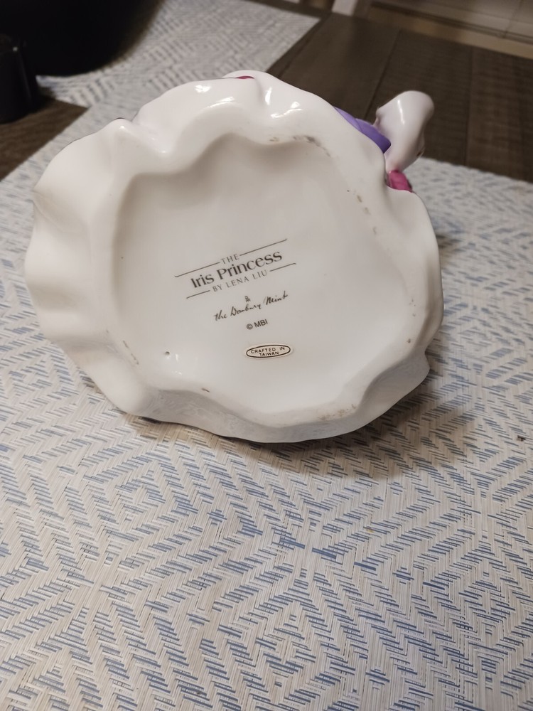 Introducing the exquisite Danbury Mint porcelain figurine, "The Iris Princess" by Lena Liu. This enchanting piece depicts a princess in all her glory, with intricate details and a delicate appearance. Made from high-quality porcelain, this figurine is a true work of art that is sure to enhance any collection.Part of the Lena Liu collection, this figurine is a perfect addition for collectors of decorative items. Whether you're a fan of princesses or simply appreciate the beauty of porcelain, this piece is a must-have. Don't miss out on the chance to own "The Iris Princess" and add a touch of elegance to your collection.