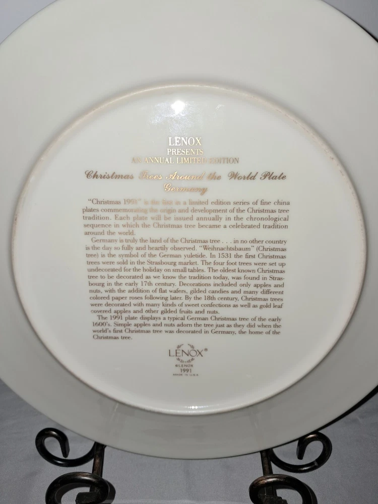 Good pre-owned condition. Lenox 1991 Christmas Trees Around the World plate. Featuring Germany. Gold rimmed around the plate. Please inquire if you need the plate measurements. Smoke free, pet friendly home. 111-1