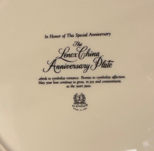 The Lenox Anniversary Platter Plate features a Floral pattern with Lovebirds and Peonies in Cream color, perfect for an Anniversary gift. This 12.5 inch round Collector Plate showcases a decorative style and a theme of Love. Perfect for collectors or as a decorative piece in a home.