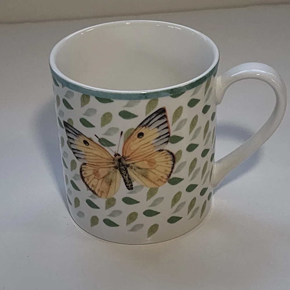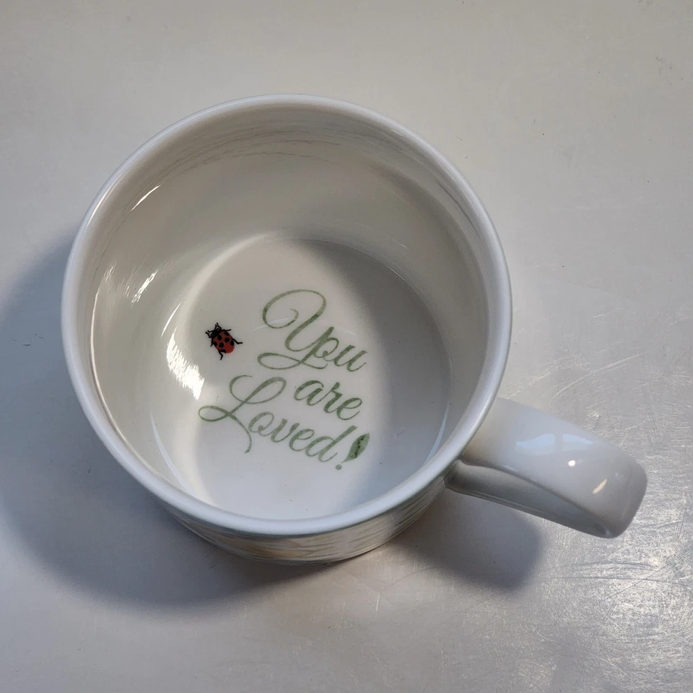 The Lenox Butterfly Meadow Sentiment Coffee Cup features a nature print of a monarch butterfly, with a round shape and a white color. Made of porcelain, this vintage coffee mug from the Lenox brand is part of the Butterfly Meadow collection. The cup is adorned with the sentiment "You are Loved" inside and is microwave and dishwasher safe, making it a charming and functional addition to your kitchen or collectibles.