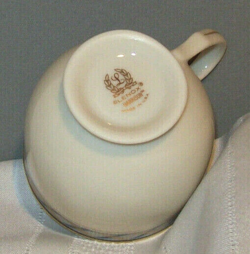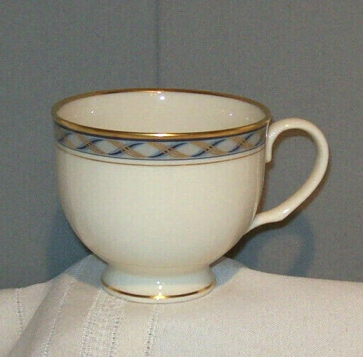 Lenox HARRISON Navy Gold Tone Cris-Cross Border China Footed Cup Mug made USA Measures 2-3/4" high Beautifully designed on beige china with a navy blue and gold-tone accented border This gold-tone accenting is also present on the base and down the handle The pattern is believed to have been discontinued in the very early 1990's. made in USA Would be considered pre-owned, but is in like-new condition. •♦•
