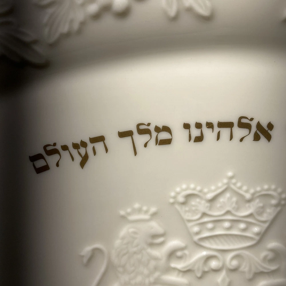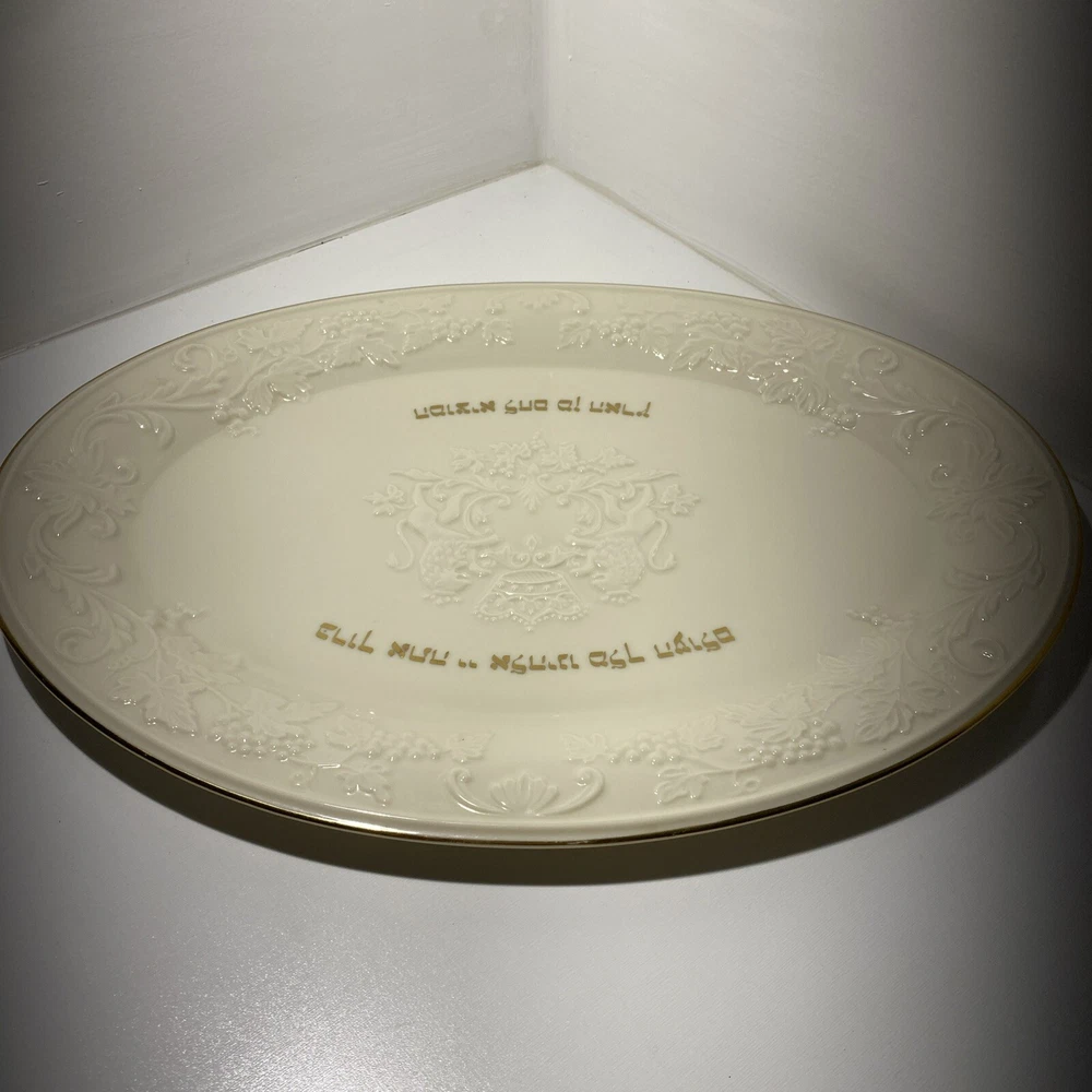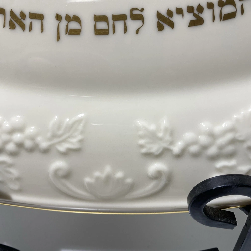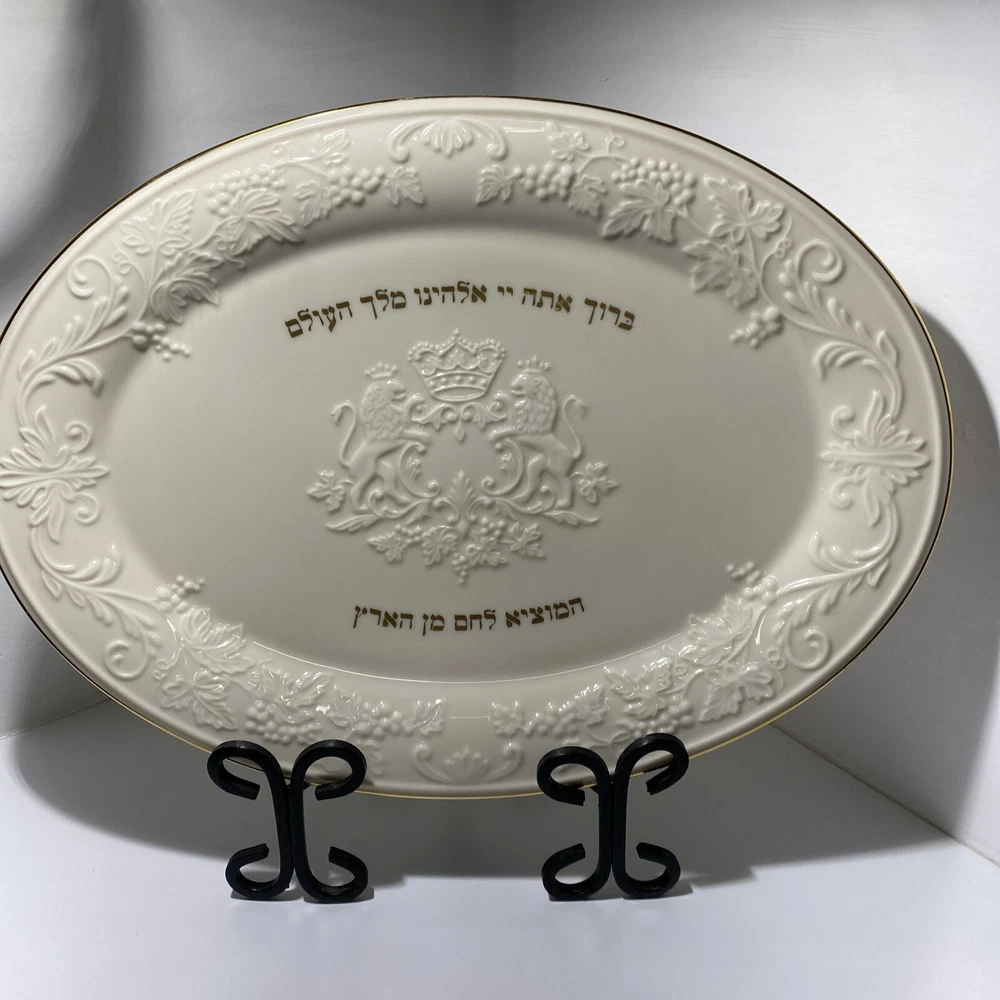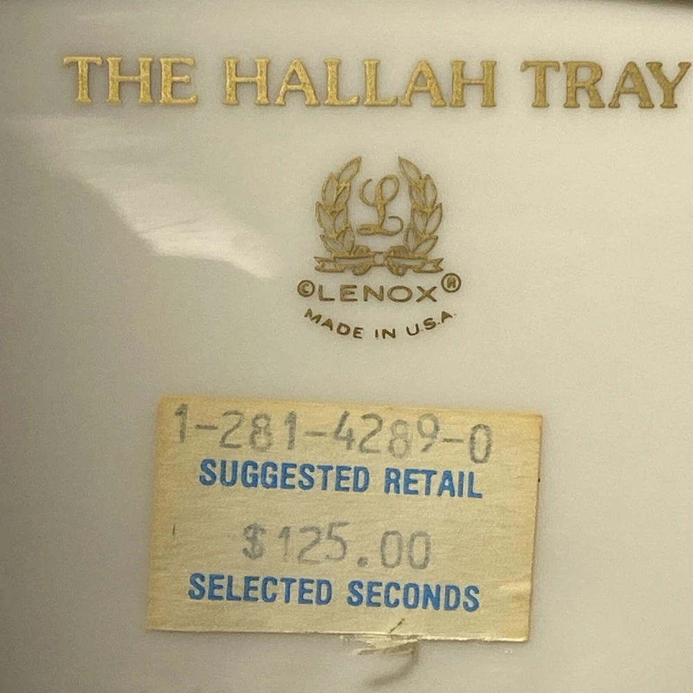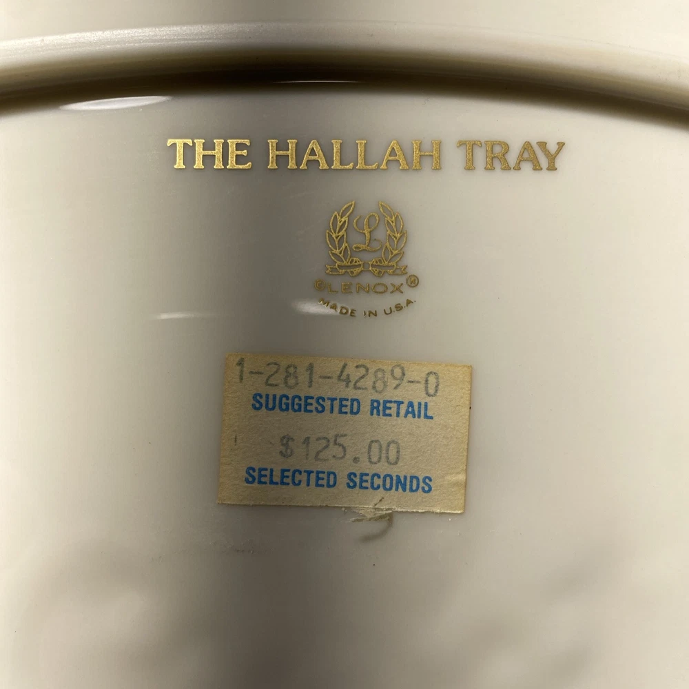 This Lenox Hallah Tray is a beautiful piece of Judaica that will surely enhance any collection. Measuring 16"x12", it is the perfect size to hold your favorite sabbath dishes. Crafted with the utmost care and attention to detail, this tray is sure to impress your guests and add a touch of elegance to your dining table. Its intricate design and high-quality construction make it a must-have for any Judaism enthusiast. Whether you're using it to serve food or displaying it as a decorative piece, this Lenox Hallah Tray is a great addition to any home., this plate is on excellent shape ,no chips or cracks