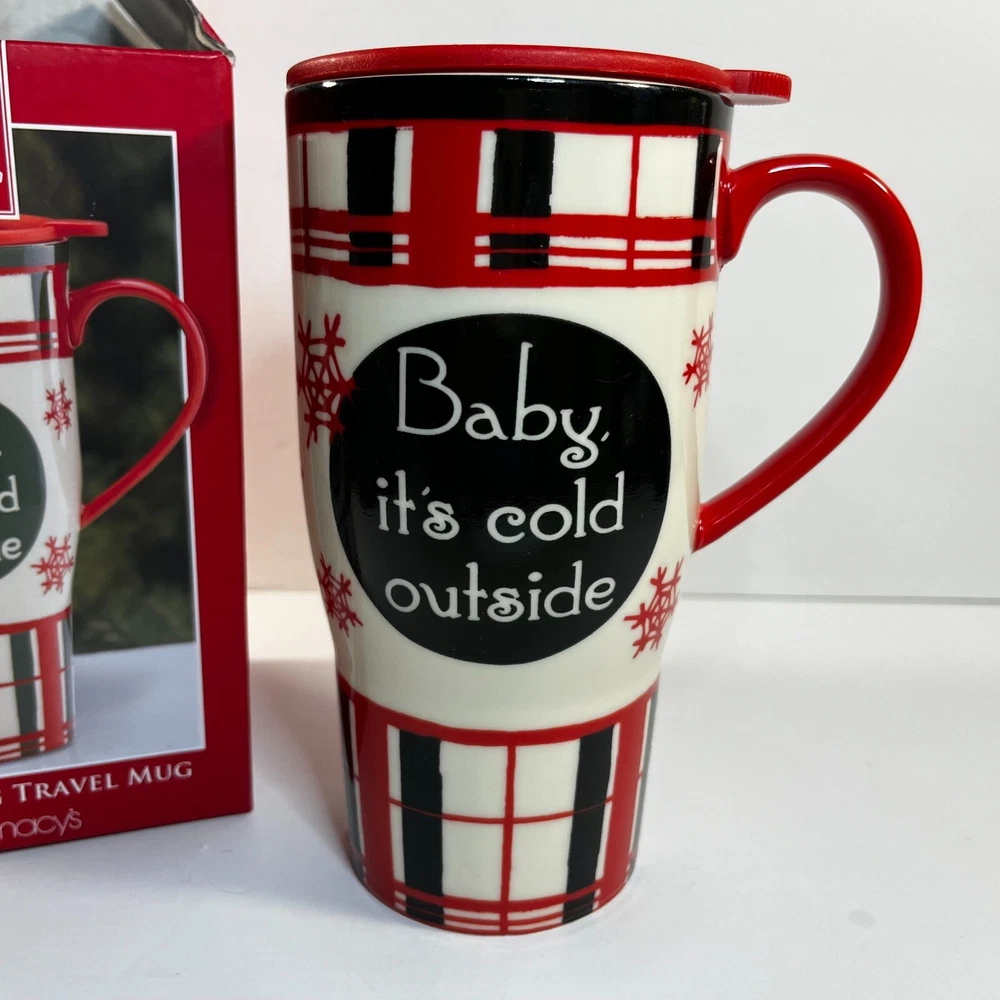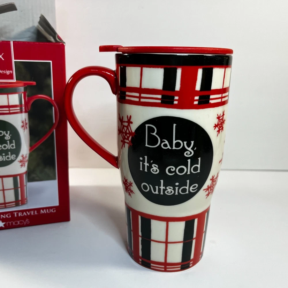 Lenox Heat Changing Travel Mug "Baby It's Cold Outside" Home for the Holiday Plaid Holds 20 oz 867363 Made of ceramic with a plastic lid Comes new with tags The Black changes to Blue when Heated