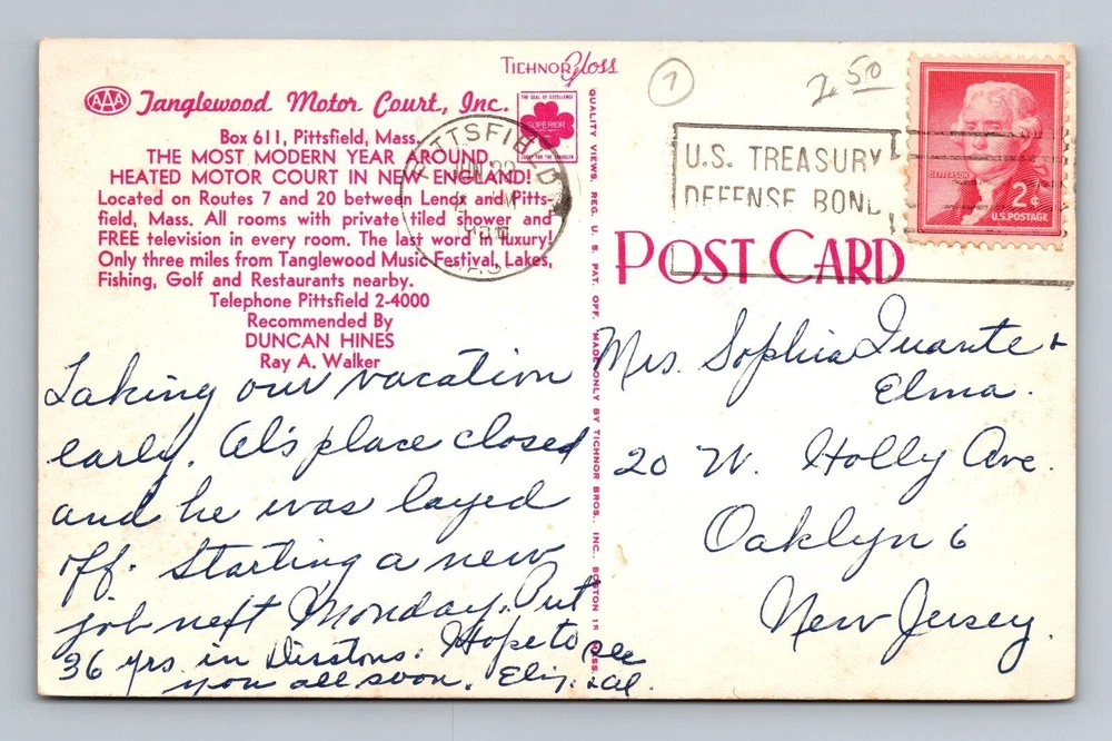 Lenox MA-Massachusetts, Tanglewood Motor Court Inc. Berkshires Vintage Postcard