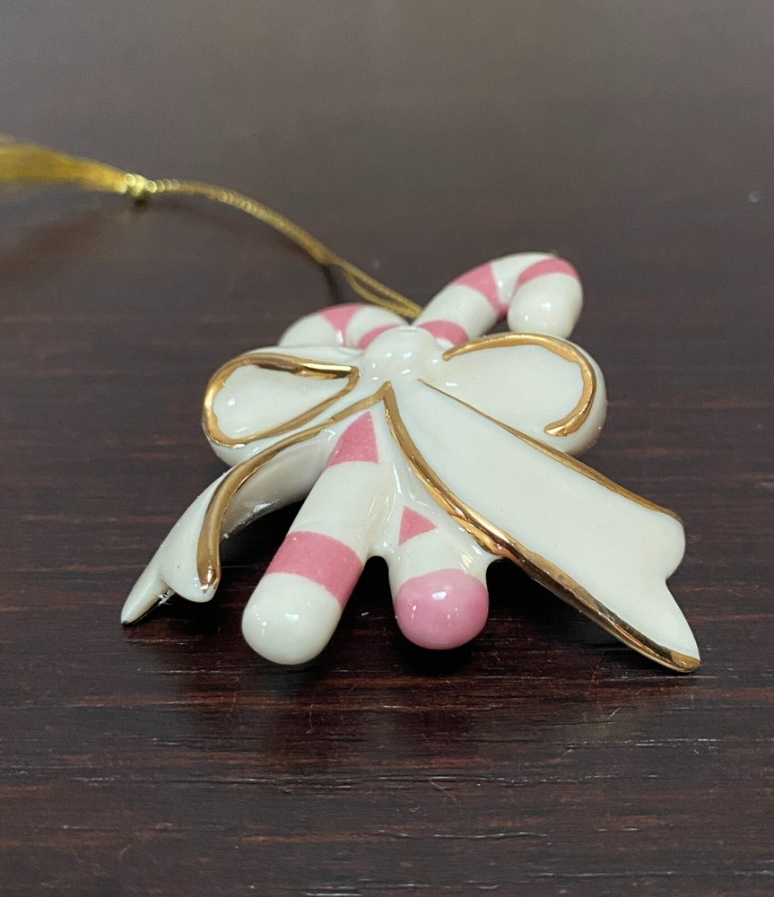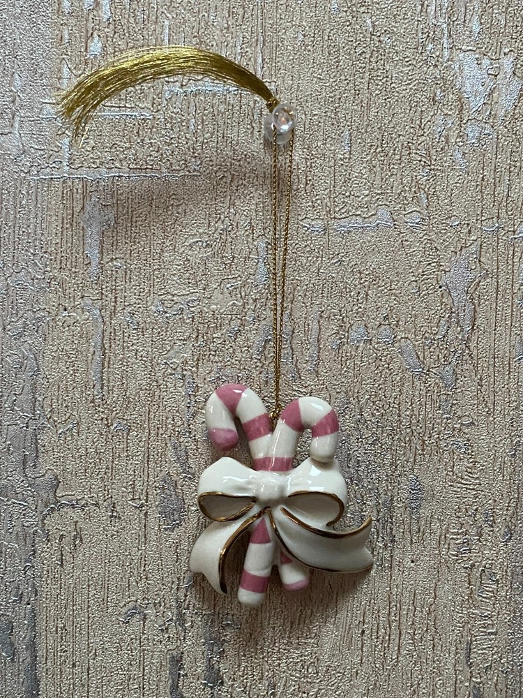 Lenox Double Candy Cane Christmas Ornament. This sweet ornament in white and dark mauve with gold trim is in perfect condition and still in the original box (which does show signs of age). It is about 2.5 inches tall, 2.25 inches wide and .75 inch deep.