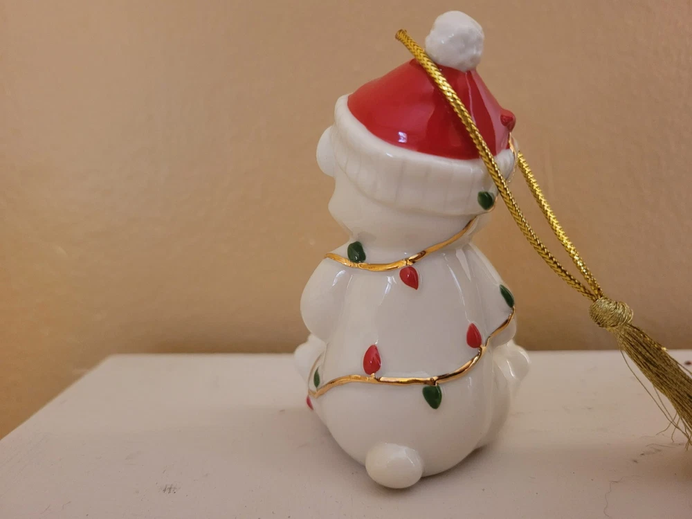 This ornament is small and porcelain. The cub is wrapped in festive Christmas ornaments. This look is perfect for any Christmas tree. -This year my Grandmother Kathy passed away. I am collecting items from her attic that others can put to good use!
