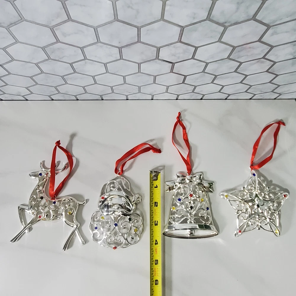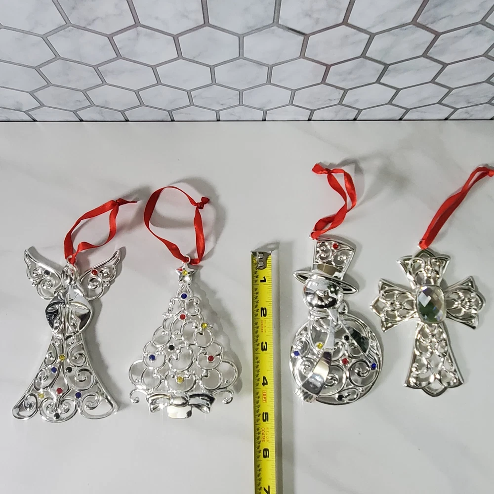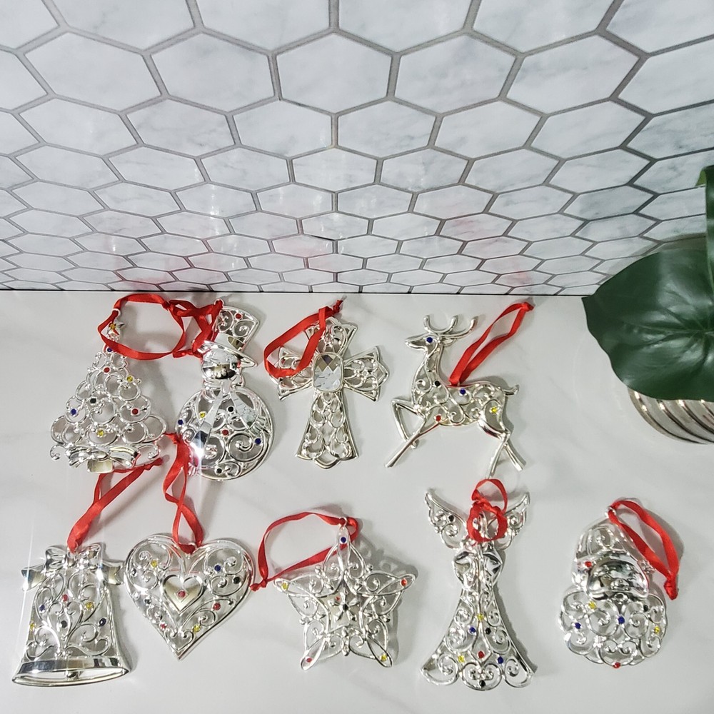 Lenox Sparkle and Scroll Silver Tone Jeweled Christmas Ornaments Set of 9 Some of the ornaments have scratches (see photos) Includes: Tree Snowman Cross Reindeer Bell Heart - has scratches Star Angel - has scratches Santa Thank you for viewing our products. PRODUCT SOLD AS IS. Please Message With Questions Prior To Purchase. If you have an issue with any of our items please reach out to us prior to contacting eBay. Thanks! Please note: We do sell new and used items. Our used items are pre-owned / pre-loved & may show signs of wear. Please view all photos for details, size, & imperfections as they are a form of the descriptions in addition to what is stated in the description section. We will do my best to inspect each item to find the best quality items possible. We do not include/replace batteries in any of our items unless they have been supplied by the manufacture and are in new unused condition. If an item is sent to you NEW / SEALED and you open it or remove the tags, it is NO LONGER ELIGIBLE FOR RETURN. Opened items / Removed tags - Means the item is NO LONGER in its original state and can no longer be sold as NEW. -Thank you for your understanding We are often asked about shipping cost. We are excited about your purchase and take pride in your package arriving to you undamaged . We wrap and cushion all necessary items prior to shipping which adds weight to your package. Unfortunately, this is not optional. Thank you for your understanding. We do not accept returns or issue refunds however in the event we do accept your return or issue a refund we do not reimburse your original shipping fee. Due to how eBay handles international shipping we do not accept any international returns. Thanks again!
