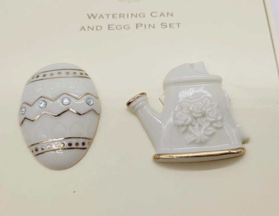 Lenox Watering Can & Egg Pin Set Fine Ivory China Spring Brooch Easter 24K