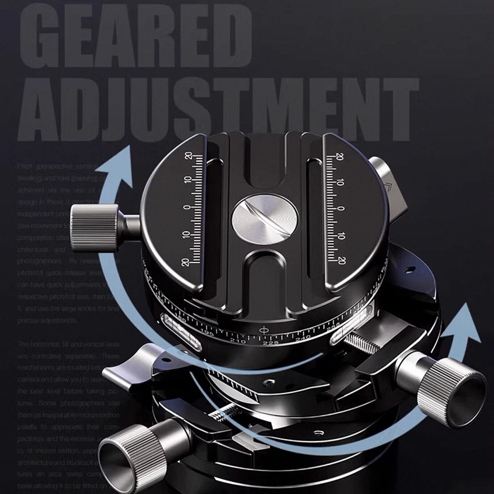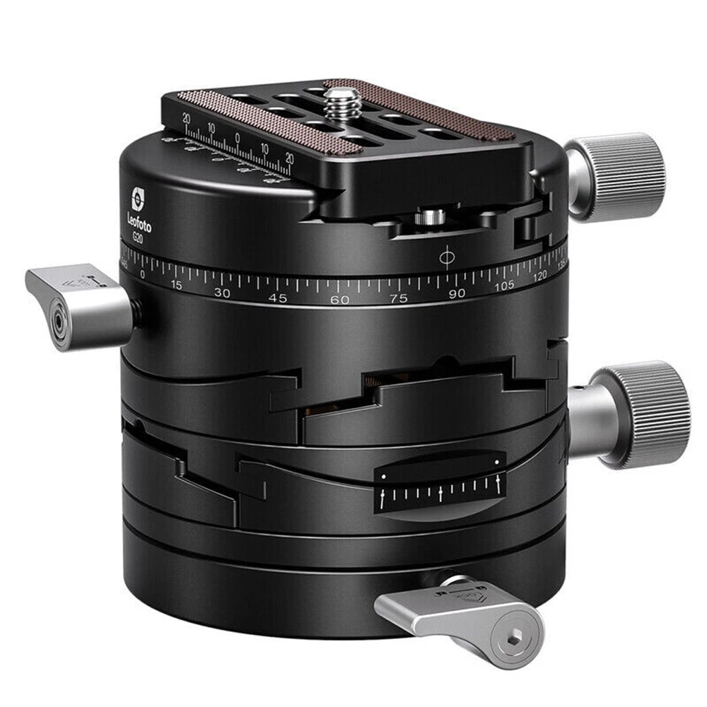 Specifications Load Capacity 30 kg Weight 560 g Mounting Screw 3/8"-16 Bubble Level Yes Movement 360 Degrees Tilt Function ± 15° Arca Swiss compatible Yes Base Diameter 75 mm Height 81 mm Panning Skale Yes Incl. QR-Plate Yes In the Box 1 x LEOFOTO G20 Geared 3D Leveler Pan and Tilt Head 1 x LEOFOTO Quick Release Plate NP-60 1 x Allen Key 1 x Pouch
