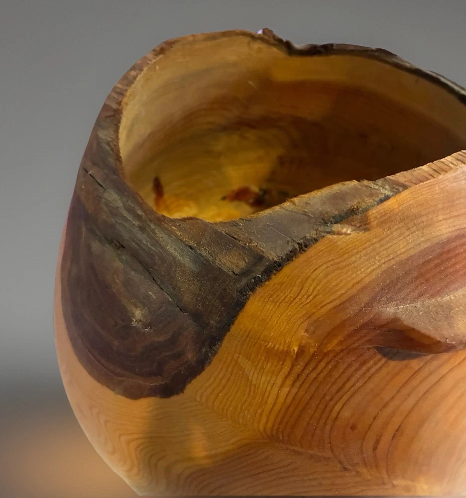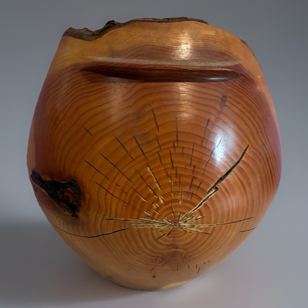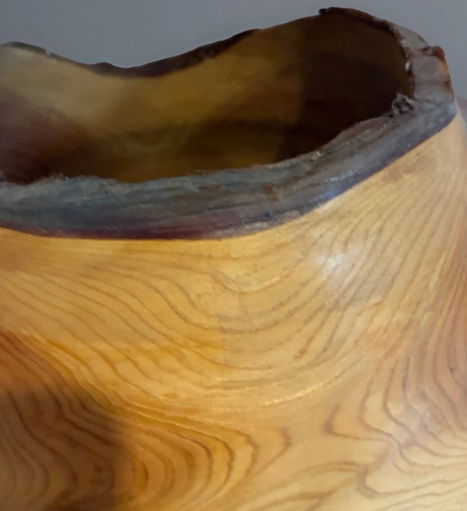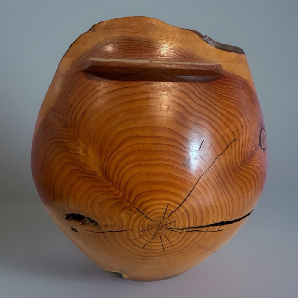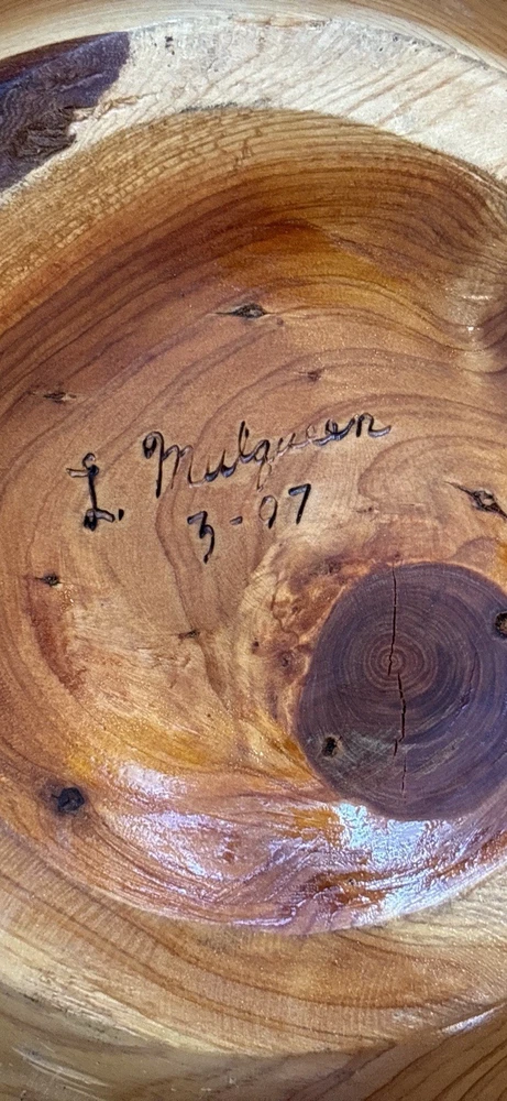 Large hand-turned solid cedar wood vessel by Len (Lenard) Mulqueen, signed and dated 3-97 on the base. Measures approximately 11 ½ ” high × 11 ½ ” wide. Sculptural hollow form with natural live-edge rim, visible growth rings, knots, and organic crack lines typical of studio woodturning. One-of-a-kind studio art piece. Len Mulqueen was a Long Island–based studio woodturner active in the late 20th century. His work includes hand-turned cedar vessels and hollow forms, typically signed and dated, many sold through galleries and craft shows in the region. 🏠 Helping special treasures find their way home… reasonable offers always welcome! ✨ I take pride in careful packaging to ensure your item arrives safely. Please buy with confidence – I maintain 100% positive feedback.