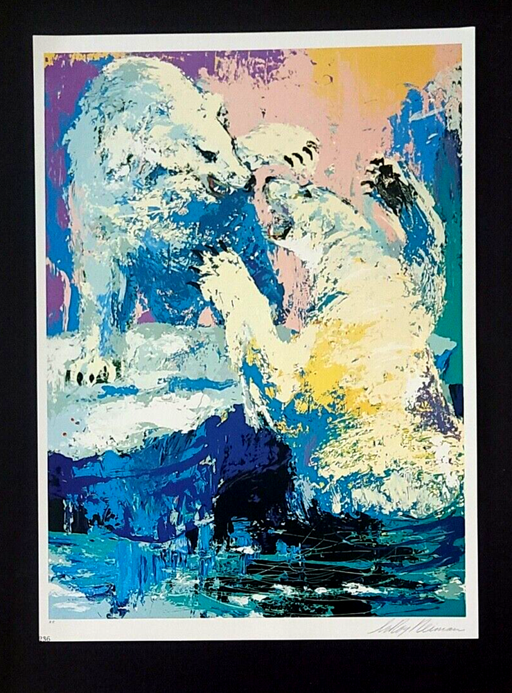 We have for Sale this LEROY NEIMAN AWESOME 1990'S PRINT ON PAPER " POLAR BEARS " SIGNED ON THE PLATE FULL OF COLOR PRINT SIZE OF THE PRINT: 10 X 8 in FRAME COVERS AN AREA OF 15 X 11 in MOUNTED AND FRAMED EXCELLENT CONDITIONS WILL BE CAREFULLY SHIPPED BY UPS
