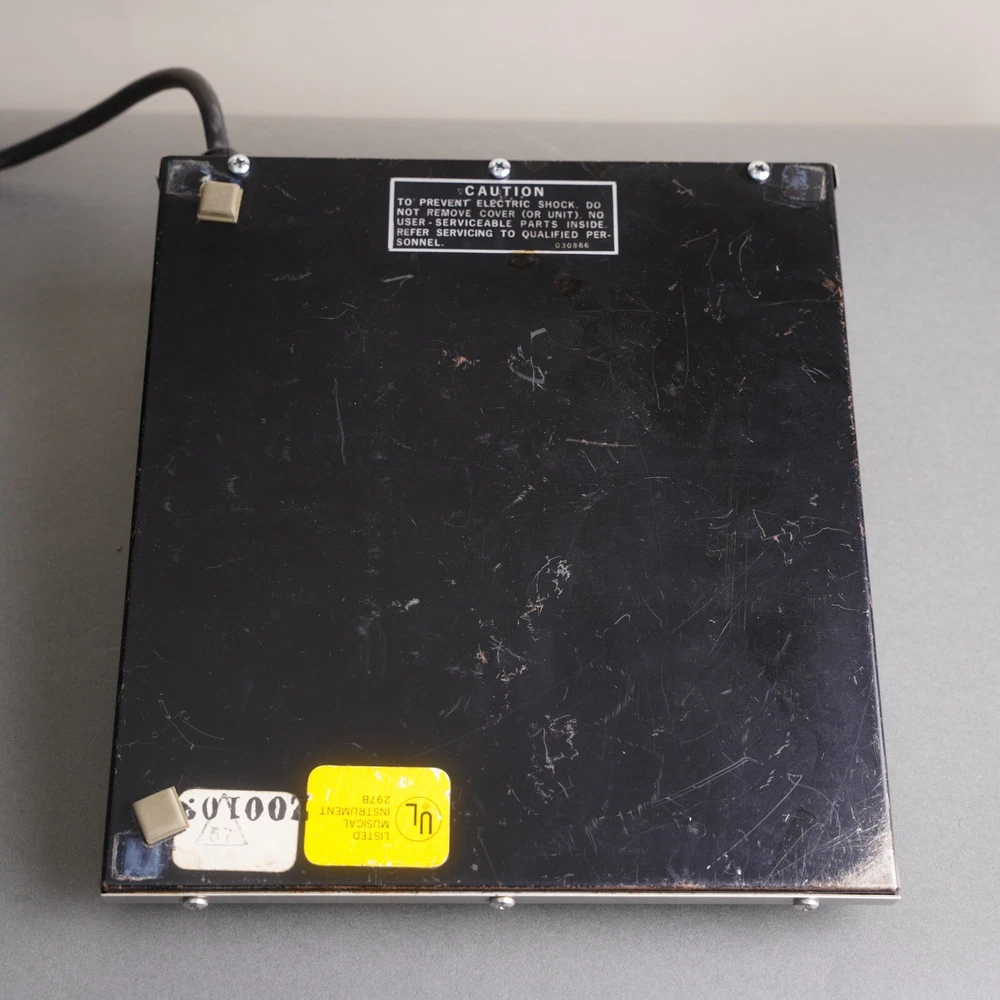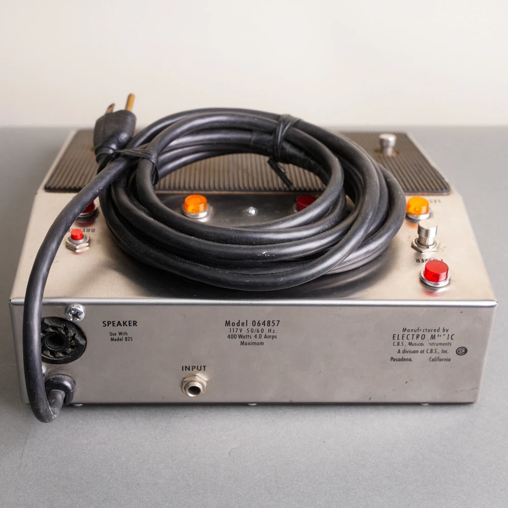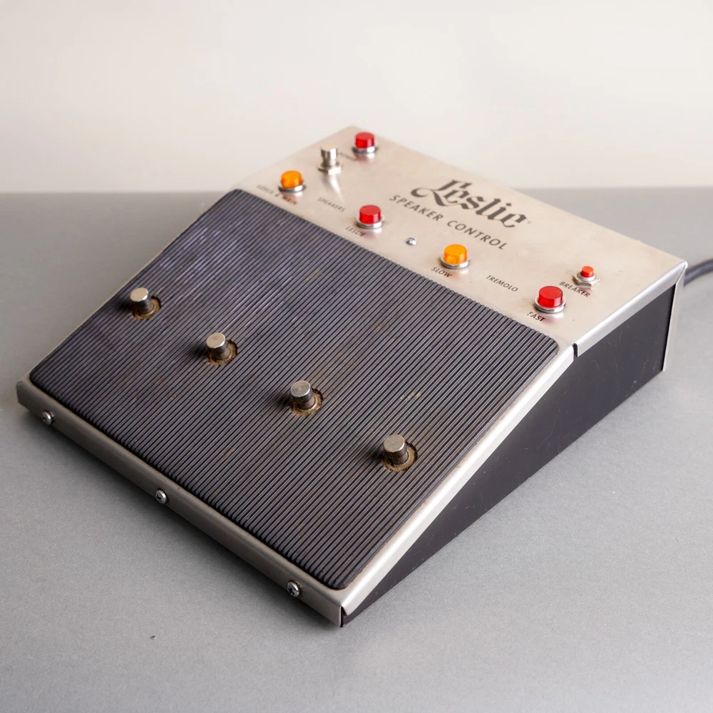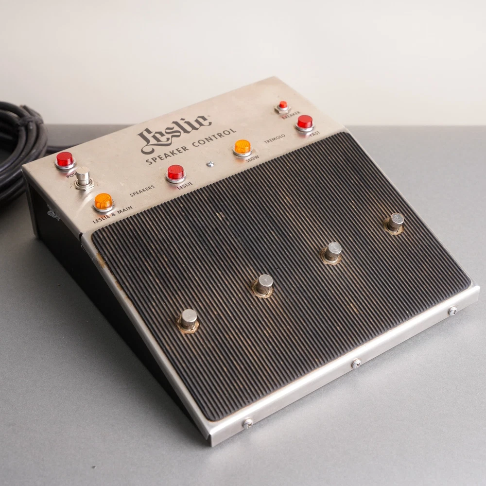 1970s Leslie Speaker Control Model 064857 foot control pedal. This unit is in excellent vintage cosmetic condition and works without issue. The three prong power cable is also in great shape. It shows light signs of use and age but is overall very clean.