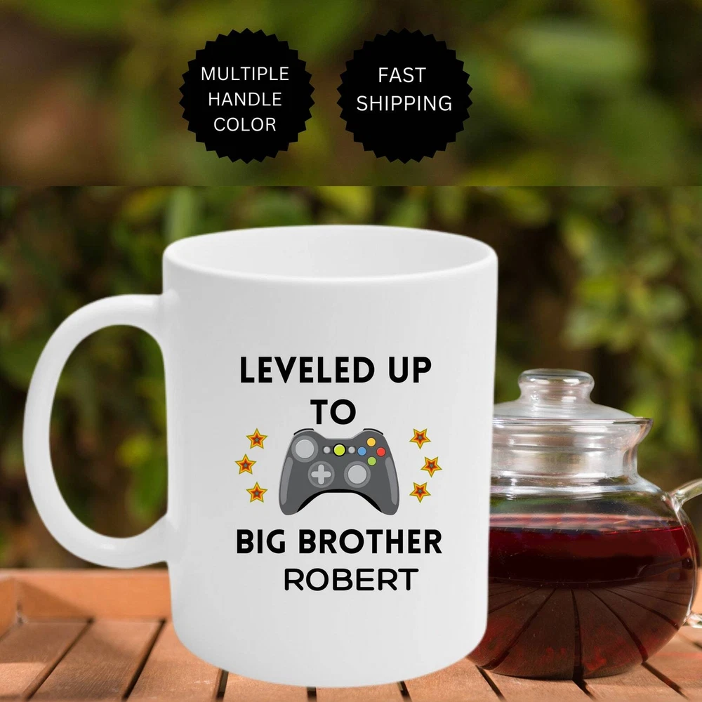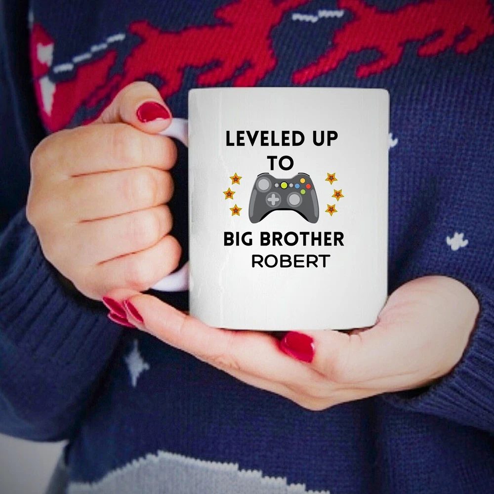 Leveled Up To Big Brother Gamers Gift Announcementmug Personalized Mug Video Game Lovers Funny New Big Brother Gift Idea Gaming Mug Product Details.. This high quality 11oz. ceramic white mug has a premium hard coat that provides crisp and vibrant color reproduction sure to last for years. Perfect for all hot & cold beverages. The highest quality printing possible is used. It will never fade no matter how many times you wash it. Material: 100% Ceramic. Print both sides. Dishwasher and Microwave Safe. High Gloss + Premium White Finish. Printed in the U.S.A. Personalized & Custom. We support personalized and custom mug to add custom, when placing an order, you can add notes to the "order note" in shipping address section. Also you can contact us directly via message. Shipping Info. Ready to ship in 1 to 2 business days, All products are made-to-order and proudly printed in the United States. Shipped by USPS and DHL, You will receive your order in 5-7 days. Replace & Refund. All products are defective during shipping broken, chipped will be replaced free of charge. You are not satisfied with the product, we will refund 100% money to you. If any other issues arise, please do not hesitate to message, we would be more than happy to assist you.