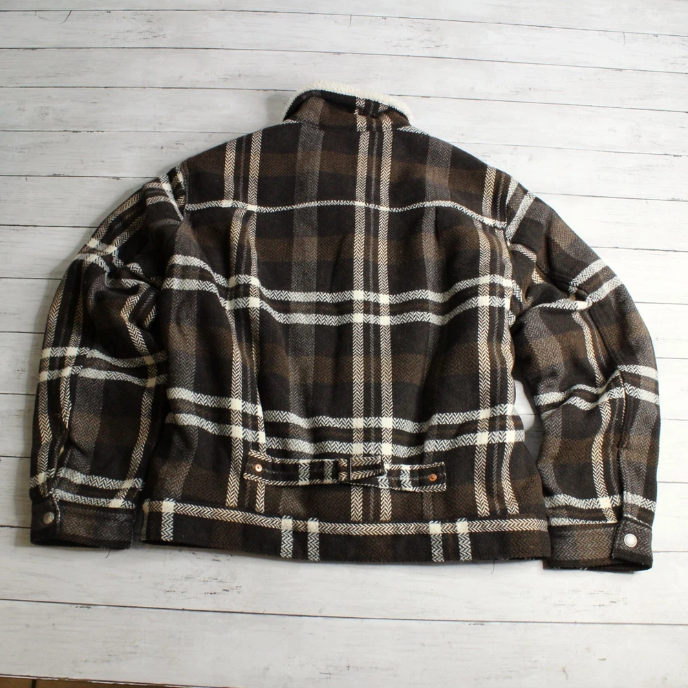 New with Tags Levi Strauss & Co Genuine Quality Clothing Wool Blend Trucker Jacket Brown and Ivory Plaid Shell: 84% Polyester 16% Wool Lining: 100% Polyester Sherpa Fleece Fall Winter Men's Size L Large This Levi's coat is brown and cream plaid with a collar and snap front. It is lined with faux shealing and is cozy for cold weather. It is extremely nice quality and is brand new with tags. Approximate Measurements Chest 25 1/2" from armpit to armpit, lying flat Length 26 1/2" from shoulder to hem