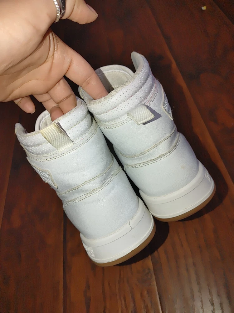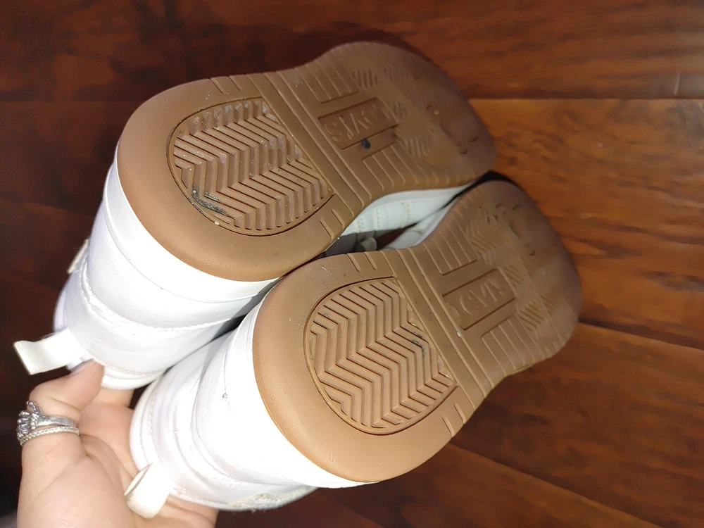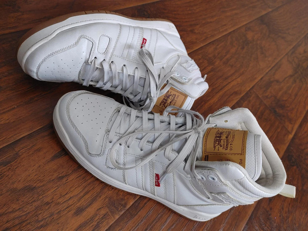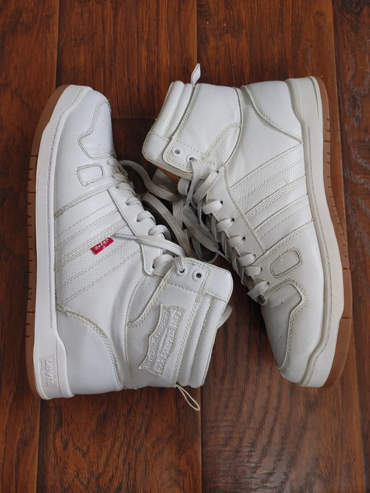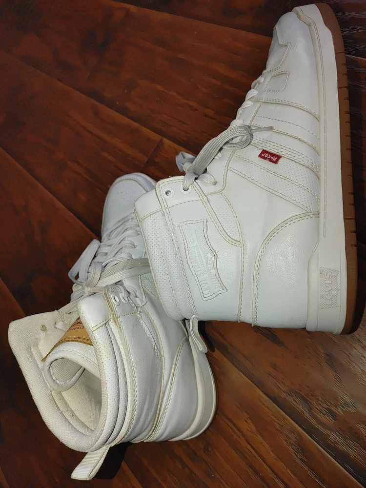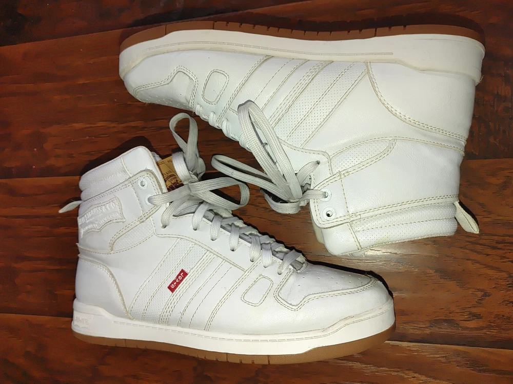 Levi Strauss all white high top sneakers. Size 9.5 men's. Pre-owned. Red brand tag on both shoes and big brand patch on tongue. Original laces and shoes show signs of wear. Some light red tint on inside/outside of one shoe. Attention: Vintage/thrifted items can have loose threads, faded colors, discoloration, pilling, and/or mild odors. Major defects will be listed. Some specialty fabrics, NWT items, or bulkier items may not be washed. All questions related to color, size, or condition prior to purchase.