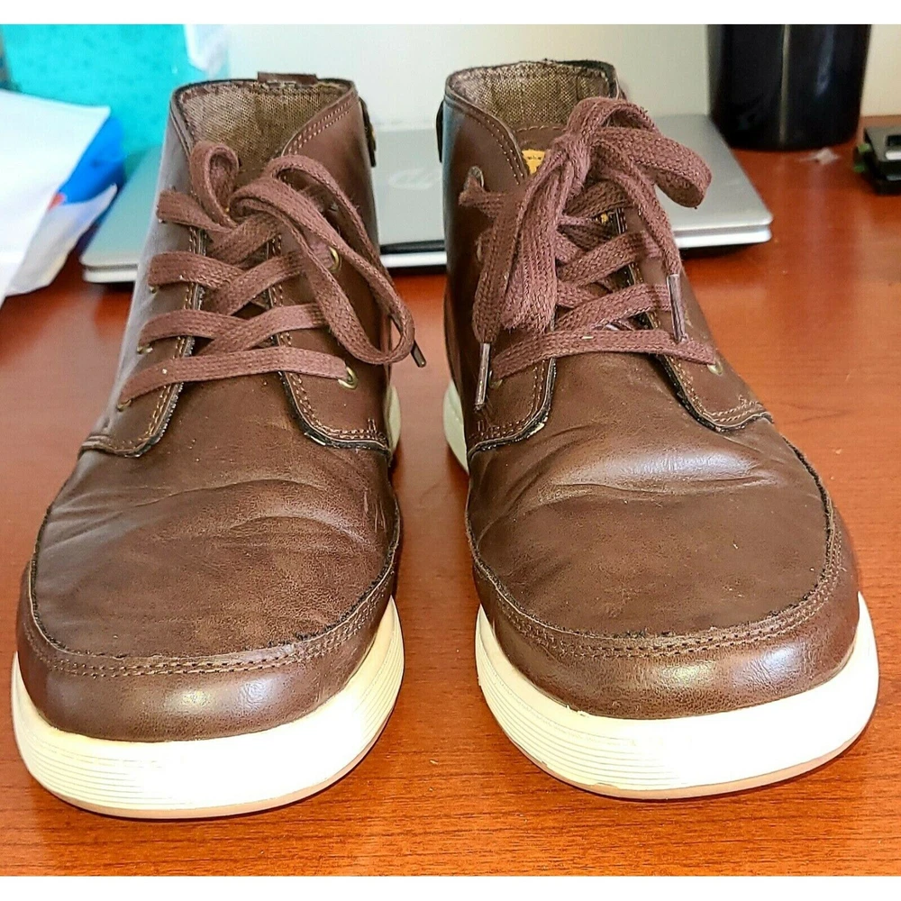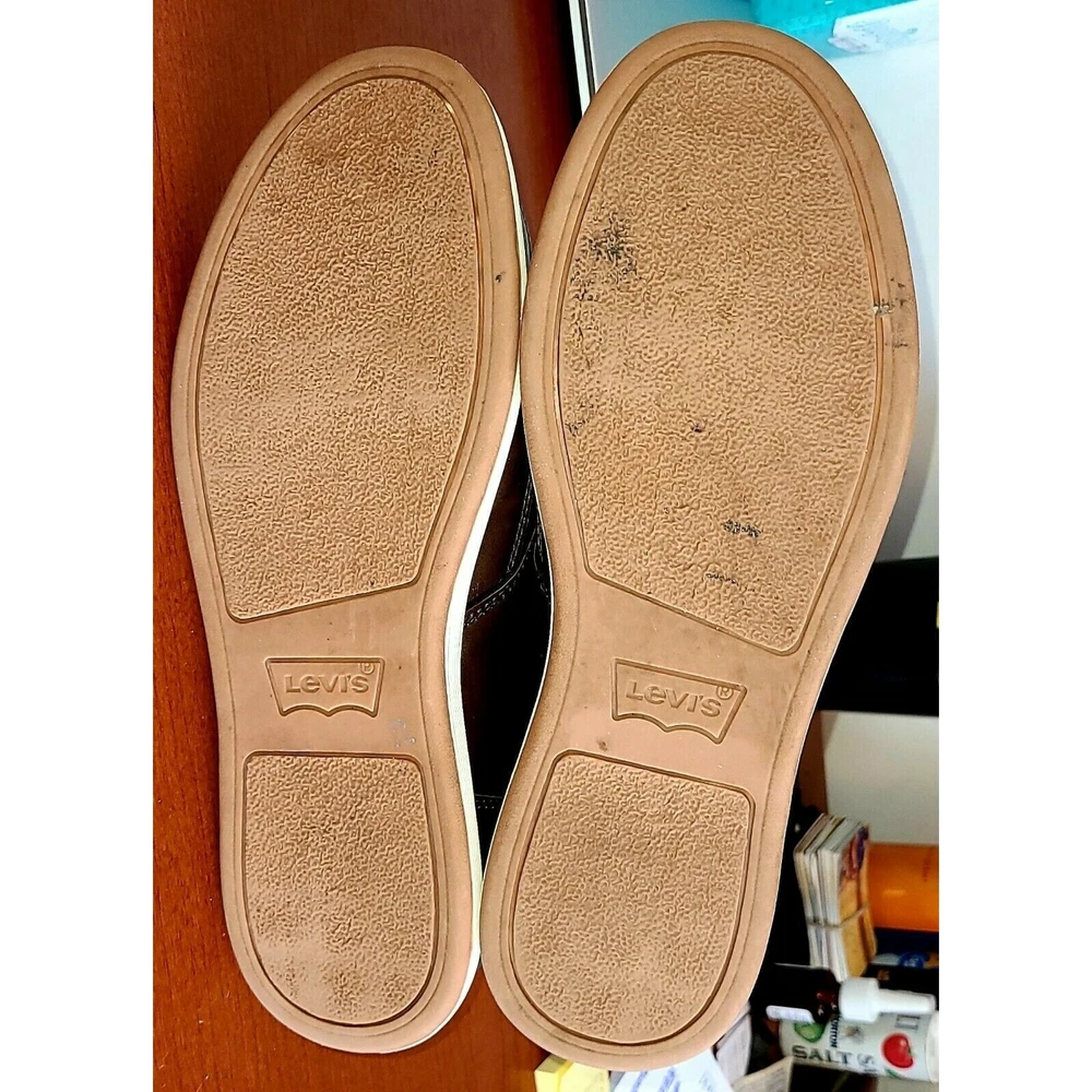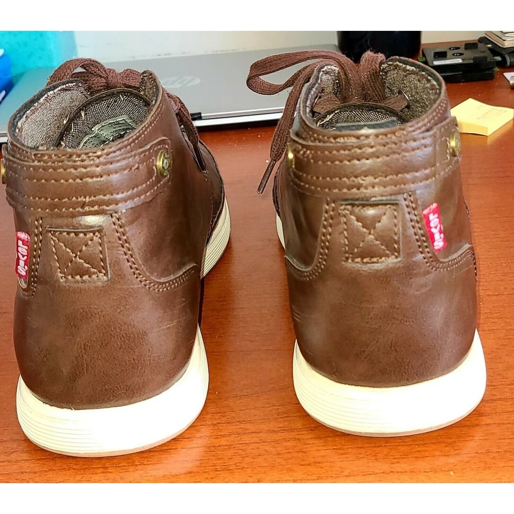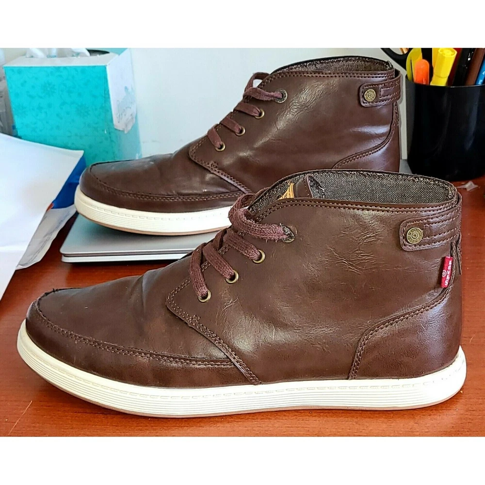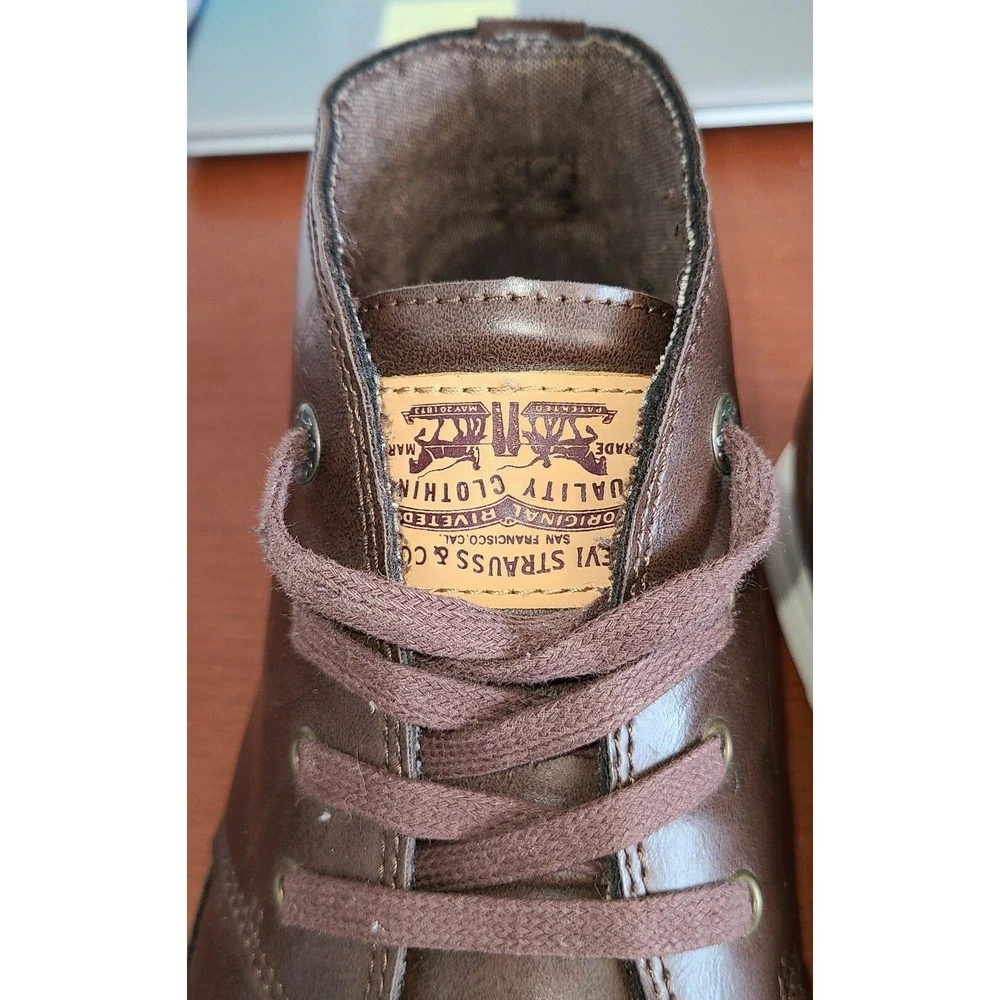 The Levi's Atwater Waxed shoe is a rare collector's item with an upside-down label. It is a casual chukka-style shoe for men with a round toe shape and lace-up closure. The shoe is made of leather and comes in brown color. It has a UK shoe size of 8.5, US shoe size of 9.5, and EU shoe size of 43. The shoe is of medium width (M) and is branded by Levi's.