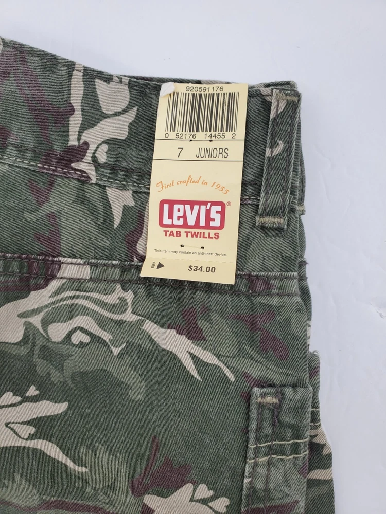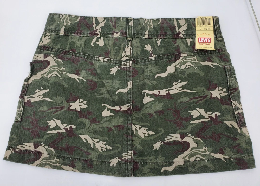 Levi's Camo Tab Twills Denim Skirt Junior's Size 7 Brand New Cute. It has front pockets with ties, with an all over camo print and it's made of 55% ramie and 45% cotton. Please check measurements to ensure fit. The waist measurement is 31 inches and the length from the top to the bottom in the front is 13 inches. The tag on the back is disconnected at the top, but still attached at the bottom see the picture.