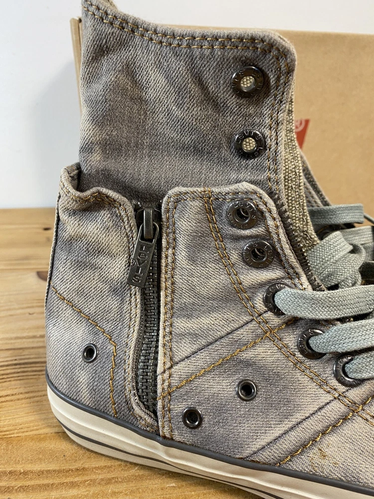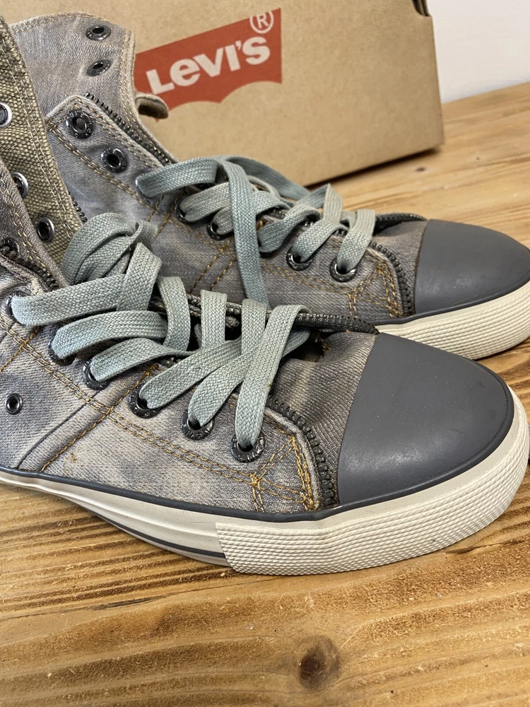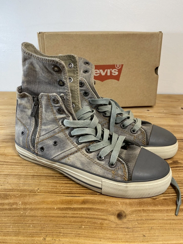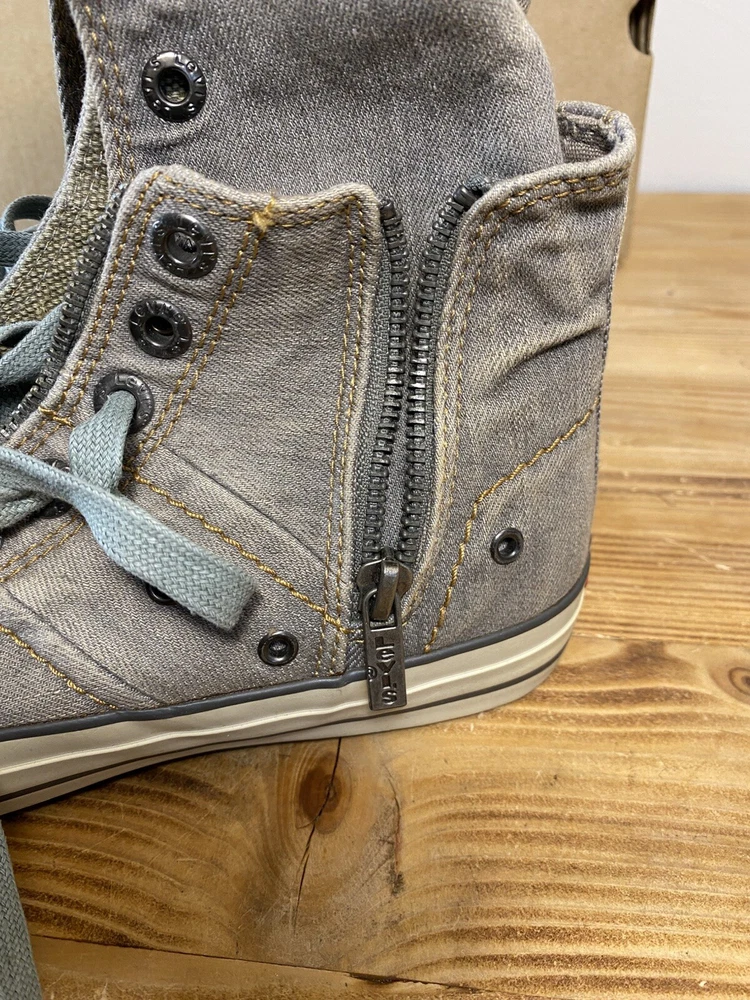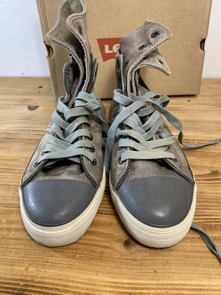 on top of the left shoe there is a small mark. Possibly a glue mark when they were fitting the soul.?? Elevate your sneaker game with these Levi’s High Top Sneakers. These stylish shoes feature a solid pattern and a round toe shape that is perfect for any casual or activewear occasion. The zip closure and double layer fold-down design add a touch of punk and rock style to your outfit, making them perfect for those who want to make a statement. The sneakers are made with a durable canvas upper and lining material, making them breathable and cushioned for all-day wear. The rubber outsole provides comfort and support, while the standard shoe width and adjustable features make them suitable for any foot size. With a retro and grunge music-inspired theme, these sneakers are perfect for those who want to add a touch of the 80s and 90s to their wardrobe.
