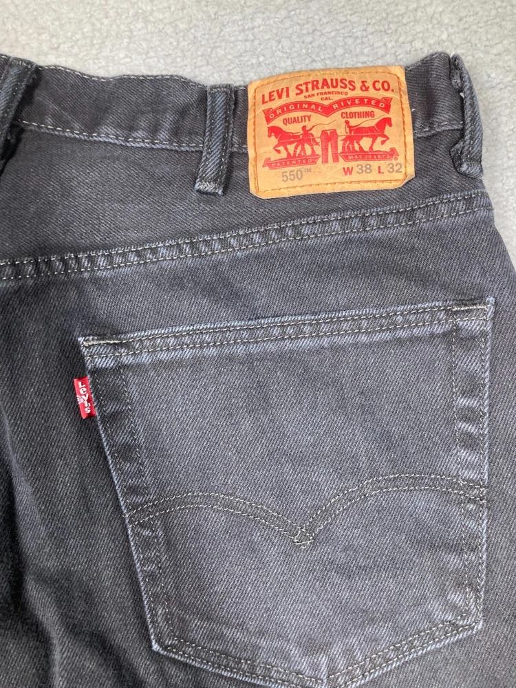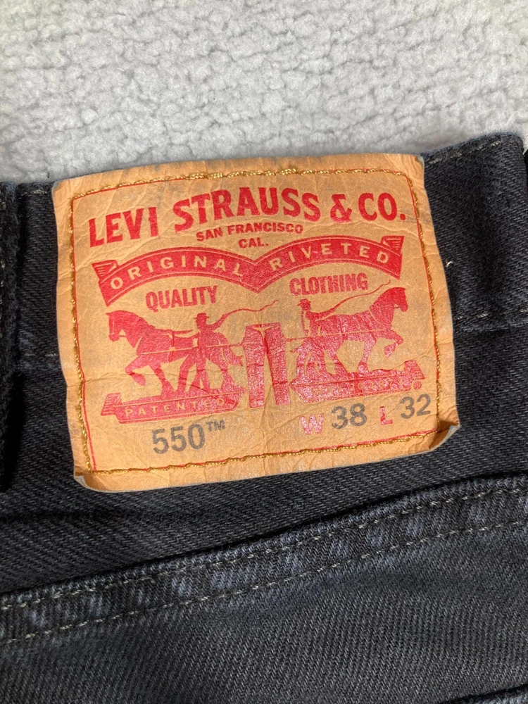 For Sale: Levis Jeans Mens 38x32 Black 550 Straight American Cowboy Rodeo Western Denim Please check photos carefully for details/measurements. Measure your favorite garment and compare. * May be wrinkled upon arrival due to packaging. * This item has been cleaned per eBay policy. We welcome questions and offers! Thank you for taking time to view and consider this item!