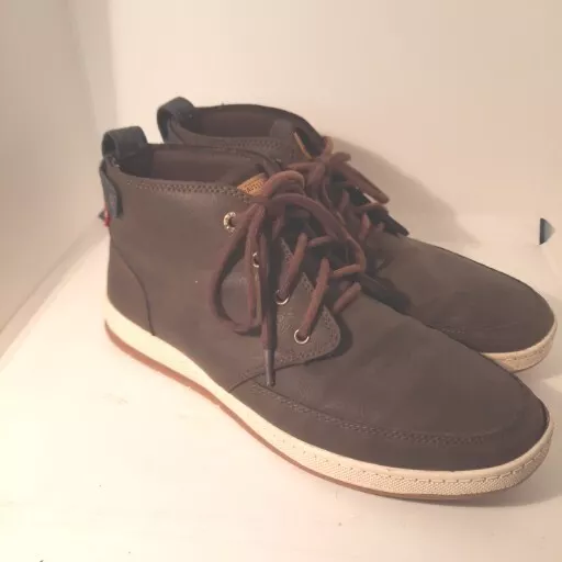 Elevate your shoe game with these stylish Levi's ankle boots. The brown leather upper and round toe shape give these shoes a classic look, while the lace-up closure ensures a secure and comfortable fit. The rubber outsole provides durability and traction, making these boots suitable for any casual occasion during the summer, fall, or spring seasons. Featuring the Levi's logo accents and cushioned insole, these boots offer both style and comfort. With a regular calf width and ankle shaft style, these boots are perfect for men who love the chukka style. Available in size US 9, these pre-owned boots are a great addition to any shoe collection. Shoes strings are slightly faded.