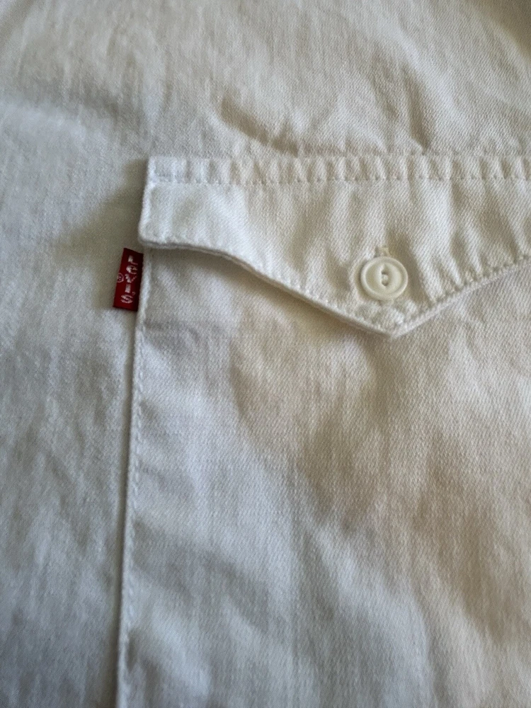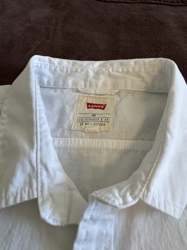 Elevate your wardrobe with this Levi's men's button-up shirt in a classic white color. Made with 100% cotton material, this shirt features a solid pattern, short sleeves, and a spread collar. The shirt is perfect for both casual and workwear occasions and is available in size 2XL. The shirt has a regular fit and is machine washable for easy maintenance. It also includes pockets and accents such as buttons and the Levi's logo. The shirt is suitable for various themes such as grunge, cowboy, classic, retro, and preppy. This Levi's button-up shirt is a must-have for any man's wardrobe.