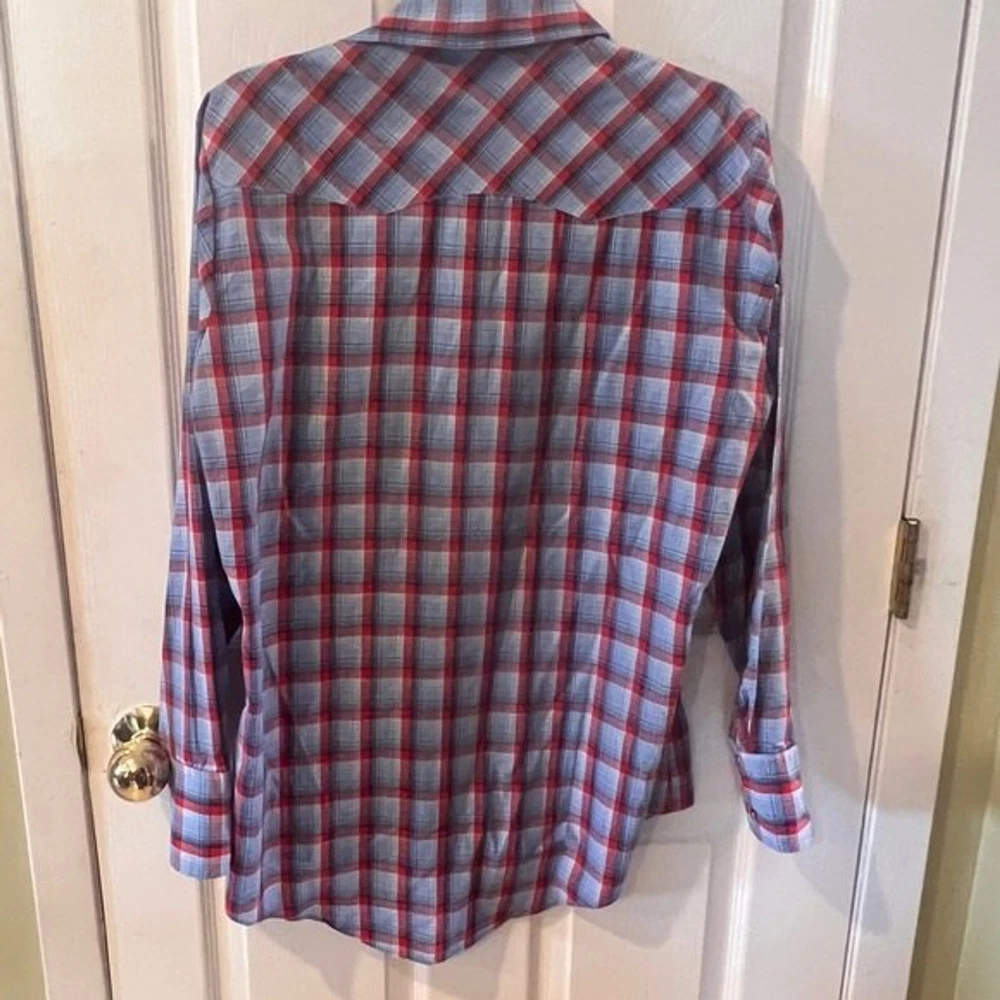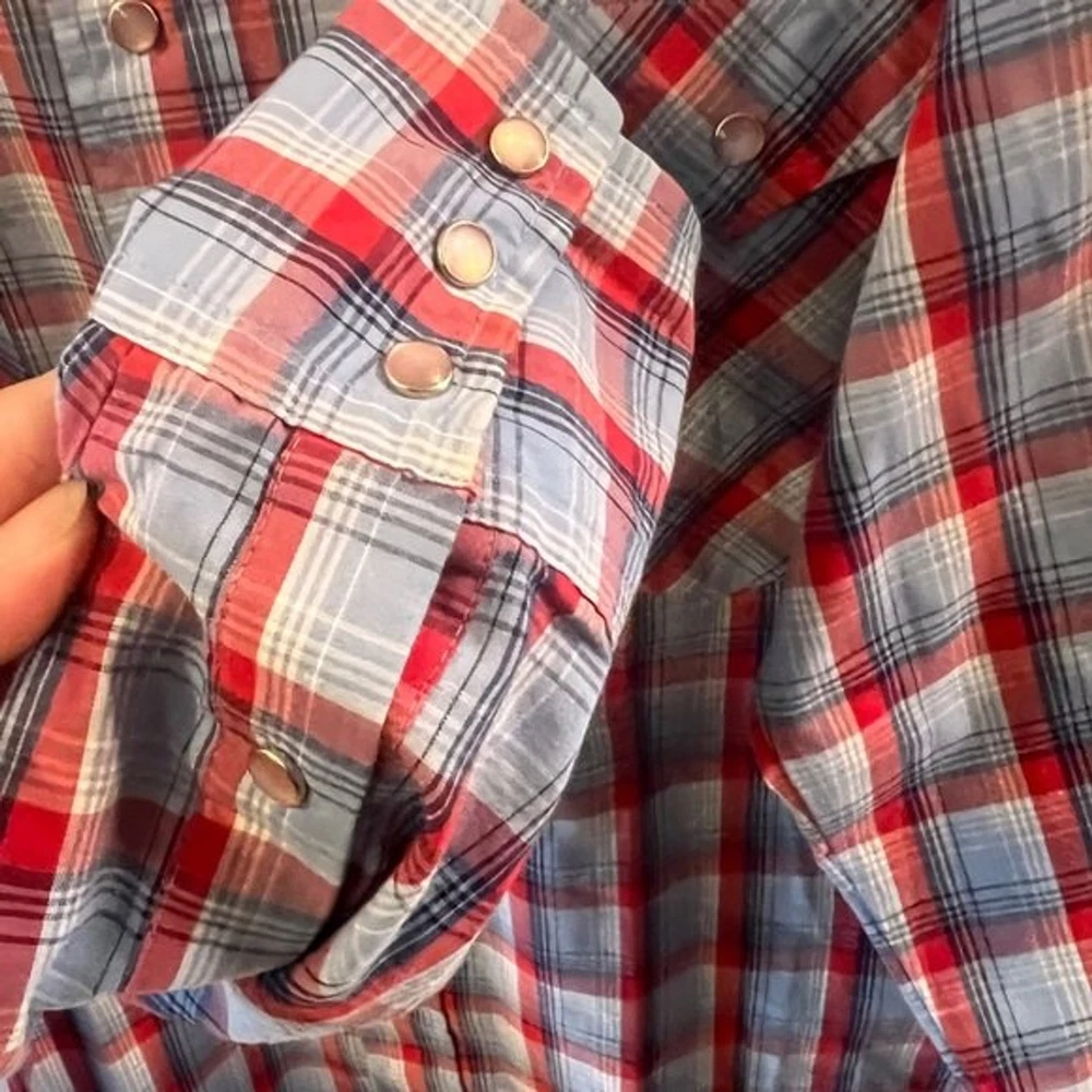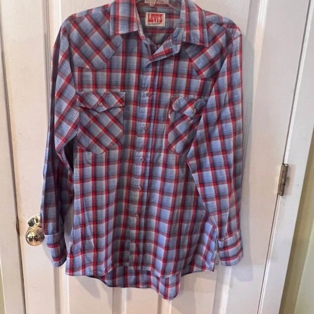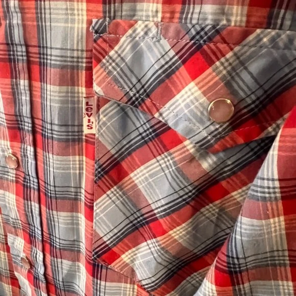Vintage 70s LEVI'S The Cowboys Tailor Pearl Snap Shirt Sz M Red Plaid Western. Pit to pit measures approx 21” Shoulder to hem measures approx 29”