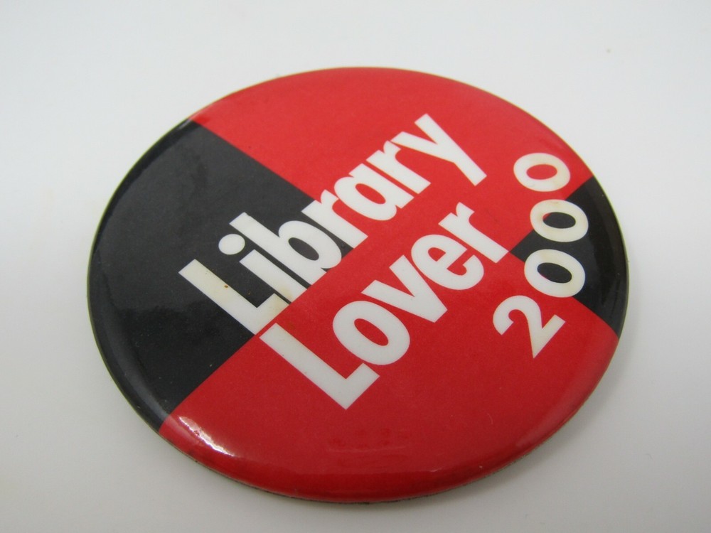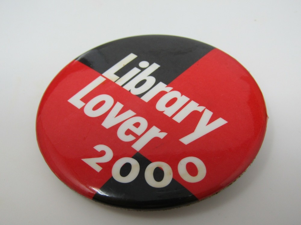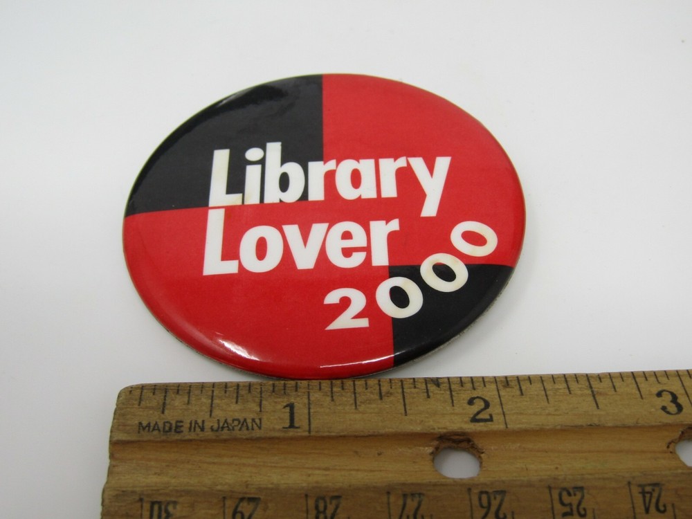 Library Lover 2000 Pin Button ~ Almost all of our items are vintage and will have various degrees of wear, but we really don't carry anything that we wouldn't own ourselves. Please take a look at the pictures for the all vintage pins to get the best idea of wear. ~