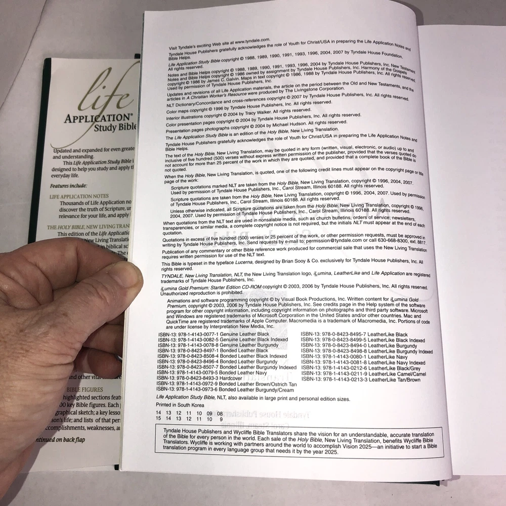 Life Application Study Bible NLT Red Letters Maps Concordance Hardcover 2007 This is a preowned study Bible. The dust jacket has some wear. There is a dent on top edge of spine underneath dust jacket. The book is clean, void of writing has square corners and bright print. Please see pictures to complete description. Thank you for shopping Missy’s Sourcing.