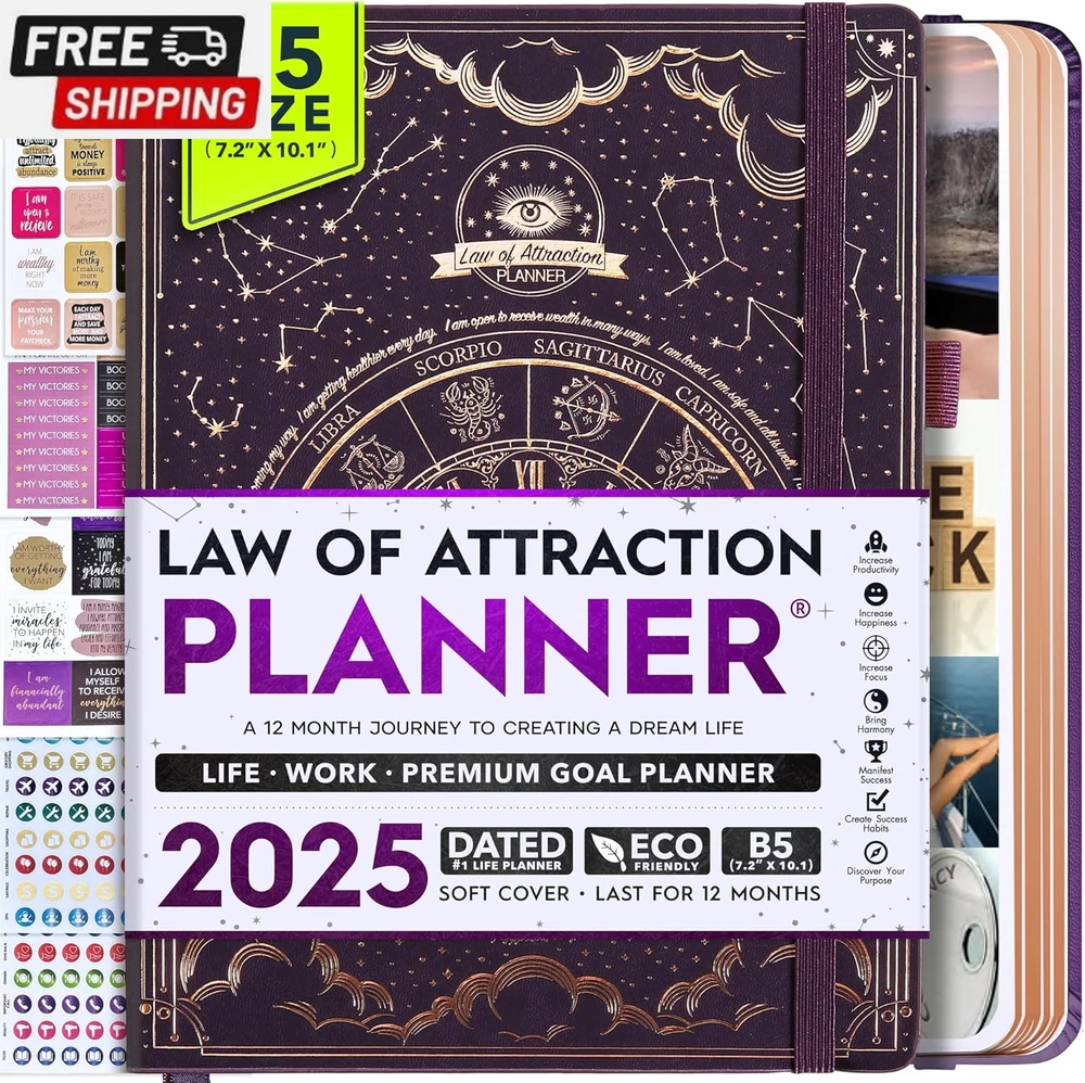 Life Planner - Undated Deluxe Weekly and Monthly Planner, a 12 Month Journey to Increase Productivity, Happiness & Enhance Organization | Life Organizer, Gratitude Journal, Agenda Planner, to Do List, Gift Box & Stickers - Start Anytime UNDATED PLANNER - All the success tools you need to create the life you always wanted. Sunday start pages, B5 Size (7.2 x 10.1 inches), thick paper 100 gsm, 248 pages of life transformation, 52 weekly, 12 monthly planning overviews & reflection, 30 dotted journal pages, up to 295 productivity stickers, habit trackers, mind maps, out foldable vision board, morning, evening routines. This life planner is UNDATED daily planner, undated weekly planner and undated monthly planner giving you the freedom to start your journey whenever suits you best. INCREASE PRODUCTIVITY AND HAPPINESS - This is a deluxe life goal planner showing you how to become the best possible version of yourself on a mental, physical & interpersonal level using the law of attraction vibration guide. This planner is a daily planner, monthly planner, weekly planner, productivity planner, goal planner, business planner, to do list planner, planner notebook & gratitude journal all-in-one. ACHIEVE YOUR GOALS USING THE LAW OF ATTRACTION - Learn how to set big goals, be happy and manage your time well, and follow the same methods millionaires around the world use to set goals and achieve them. This monthly planner undated planner, life planner, hourly planner, yearly planner, work planner, schedule planner or appointment book. It's a perfect planner for women and men. REDUCE OVERWHELM, STRESS AND FIX PROCRASTINATION - Follow a unique 8 step system that will help you bring back harmony, clarity, and peace in your life while achieving your goals. This planner is perfect for birthday gift, mother's day, anniversary gifts, and christmas gifts. LUXURIOUS & TOP QUALITY- Ideal for both women and men, perfect for entrepreneurs, professionals, college students, and everyone who has a burning desire to turn dreams into reality. No questions asked money-back guarantee. Product Description UNDATED DAILY PLANNER READY TO CREATE THE LIFE YOU ALWAYS WANTED WITH THE BEST LIFE PLANNER ON THE MARKET? The ONLY Law of Attraction Planner 2025 comes with Udated Daily Planner options that helps you find your Purpose, Eliminate Procrastination, Anxiety, Overwhelm and Stress by Guiding you Through 8 Simple Steps To Maximize your Productivity, Increase Creativity and Passion for Crushing Your Goals! The Law of Attraction Planner is a Life planner - A Manifestation Journal aids you in manifesting your desires through the practice of keeping a Manifesting Journal - a Time Management Planner - a Self Care Journal - a Vision Board Journal - a Life Coach - Work Planner, Agenda and Personalised Organiser , All in one. It combines the manifesting abilities and spiritual guidance from the law of attraction that also includes all the tools to achieve your short and long-term goals like principles of wealth building, and self-motivation all integrated into a daily schedule planner. Experience the transformative power of a 3-minute Positivity Journal and Planner, designed to create a manifesto effect from day 1! The Law of Attraction Planner contains 248 life-changing pages with 45 journal pages, habit trackers, mind maps, out foldable vision board, morning & evening routines. It also has a pen loop and 2 bookmarks. THE LAW OF ATTRACTION PLANNER WILL BE YOUR SECRET "UNFAIR ADVANTAGE" 2025 Hourly Planner , THERE’S A SMARTER WAY TO PLAN YOUR BEST YEAR! A LIFE THAT’S WORTH IT, IS WORTH PLANNING Once you start using the law of attraction's unique 8-step process you will understand how high achievers can accomplish so much more success in the same amount of time everyone else has. The 8-Step Law of Attraction Roadmap guides you to improve in all areas of your life from your career, family, health, fun activities, habits, emotional, relationships, spiritual, and life goals. As you continue using the law of attraction planner you will forget Incomplete, LOW-QUALITY Planners That ARE MISSING IMPORTANT STEPS AND Will Never Lead you To True Success! The Law of attraction Planner includes special tools to help you achieve your short and long term goals and to help you find your passion and purpose in life. This is the only Planner with the key self-development processes found inexpensive personal development books and life coaching courses that have been divided into 8 steps for radical life transformation. Let’s take a look at the 8-steps inside the Freedom Mastery’s Deluxe Law of Attraction Planner that similarly priced but lower quality planners lack. The 8-Step Law of Attraction Roadmap guides you to improve in all areas of your life from your career, family, health, fun activities, habits, emotional, relationships, spiritual and life goals. Life planner - a Manifesting Journal - a Time Management Planner - a Self Care Journal - a Vision Board Journal - a Life Coach - all in one YOUR IDEAS AND PLANS DESERVE TOP QUALITY PLANNERS THAT LAST A LIFE TIME The Law of Attraction Blueprint life planner was designed to give you a new self-awareness personal planner and self-discovery daily schedule planner of your life as it guides you to attract what you desire. The Law of Attraction Planner is the first Planner to use a Reward Structure.(Step 1&2). Science has confirmed that using a Reward on completing a goal creates positive neural pathways to better habits. The daily planner 2025 guides you to find your purpose and passion and see on an organized notebook the vision of your future life . Writing your mission statement on an appointment book helps you clearly know what is most important to you with the help of a productivity planner so you are on the right path to using the power of the law of attraction in creating a happier life. BEST Goal Planner 2025 Vision Board The Law of Attraction daily planner follows the same methods used by bi