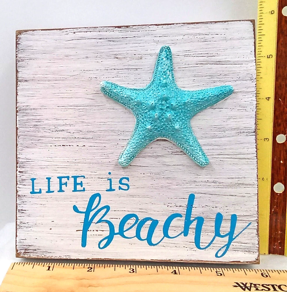 Life is Beachy Wood Box Sign Starfish Nautical White Blue Distressed Rustic 6"
