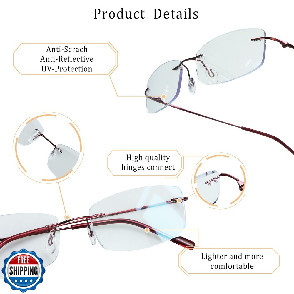 LifeArt Blue Light Blocking Computer Reading Glasses, Men’s and Women’s Rimless Frame, Anti Eyestrain, +1.75 Magnification Features Advanced Blue Light Blocking Lenses: Reflect and filter blue light with a 7-layer anti-reflective coating, reducing glare, preventing color distortion, and improving sleep by minimizing eye-strain during screen time. Superior Clarity & Durability: High light transmittance helps ensure no noticeable yellow tint, maintaining true colors, while the ultra-thin 10μm multi-layer coating enhances scratch resistance and lens longevity. Customizable Magnification Options: Available in strengths from +0.00 to +4.00, these magnified lenses provide sharp focus for close-up tasks like reading, working on laptops, or viewing screens. IMPORTANT: Please select the correct magnification so your order can be properly filled. The one you choose now is +1.75 Magnification Lightweight & Versatile Design: Classic rimless design with an ultra-lightweight build (0.28oz) create a comfortable, universal fit suitable for most face shapes and all-day wear. Refer to images for glasses dimensions. Premium Quality Assurance: Our eyewear is designed to meet the highest standards of durability and performance. We have a 30-day free return policy. Contact us anytime for support or if you experience any issues. Shipping Free & Fast Shipping: We offer free shipping to most of the USA with a normal delivery time of 3-7 days. However, due to the current situation, additional delivery time (up to 3 weeks) may be required for some items. Alternative Carriers: We may use alternative carriers (e.g., USPS, FedEx, UPS) to ensure your package arrives safely and on time. Due to the use of multiple carriers, we are unable to provide a tracking number automatically. Handling Time: Orders are processed and shipped within 1-2 business days of receiving cleared payment. Shipping Restrictions: Shipping to Alaska, Hawaii, Puerto Rico, Guam, and other US territories may incur shipping charges or delivery restrictions. Please contact us before ordering, or your order can be refunded/cancelled. State Restrictions: Certain items may not be shipped to California due to state regulations. Contact for Tracking Updates: If you require tracking updates or have any concerns about the delivery of your order, please feel free to contact us, and we will be happy to assist you. Return Policy 30-Day Hassle-Free Returns: If you are not completely satisfied with your purchase, you can return the item for free within 30 days of receiving it for a full refund or exchange. Easy Return Process: Contact us, and we will provide you with a prepaid return shipping label and detailed instructions. No Restocking Fee: There are no restocking fees for returns. However, the buyer is responsible for return shipping costs if the return is not due to a seller"s error. Refund Processing: Refunds will be processed within 1 business day of receiving the returned item in its original condition. Feedback Your feedback is extremely important to us. We strive to provide the best products and customer service possible. If you are satisfied with your purchase, please take a moment to leave us a positive review. If you have any concerns or issues with your order, please contact us before leaving negative feedback. We are committed to resolving any problems and ensuring your satisfaction. Contact Us If you have any questions or concerns, please feel free to reach out to our customer support team. You can contact us through the eBay messaging system. We are available Monday to Friday, 9:00 am to 5:00 pm EST, and we will do our best to respond to your inquiry within 24 hours. Thank you for supporting our small family business!