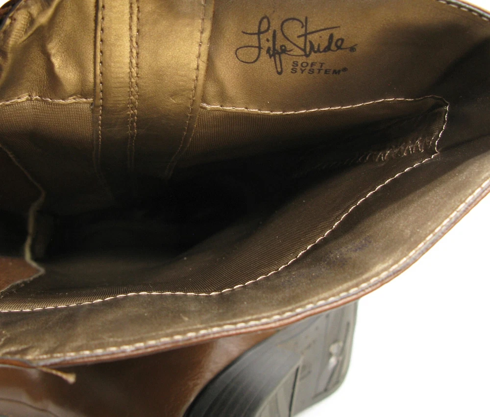 Features: Comfort Closure: Zip Style: Riding Boot Brand: LifeStride Shoe Shaft Style: Knee High Model: Rosaria Theme: Designer, Modern Character: Boots Type: Boot US Shoe Size: 10 Heel Height: Low (1-1.9 in) Occasion: Business, Casual, Party/Cocktail, Travel, Workwear Heel Style: Block Pattern: Solid Department: Women Color: Brown Shoe Width: M Accents: Buckle Toe Shape: Almond Toe Upper Material: Faux Leather