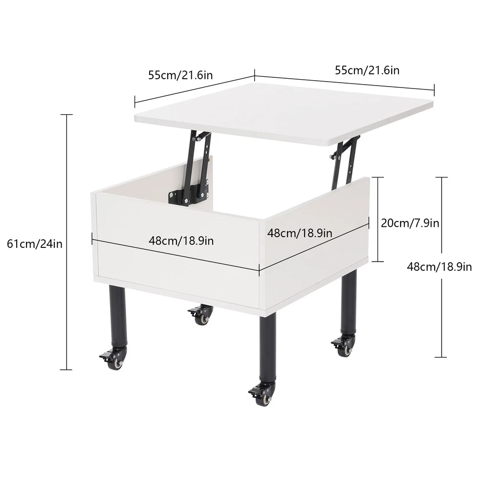Lift Top Coffee Table, Coffee Tables, Modern Coffee Table Description This liftable coffee table, as the wisdom of modern home design, adds a touch of style and convenience to your home living space with its unique liftable design and practical functions. It is made of high-quality materials and fine craftsmanship to ensure high stability and durability. Even in frequent daily use, it can maintain its elegant form and accompany your family for a long time. Key Features Safe and Durable: It is made of high-quality solid wood board and spray molding iron bracket, which is wear-resistant, rust-resistant, and durable to meet your long-term use needs. Moreover, the E0 grade environmentally friendly board does not emit irritating odors, making it safer for you to use. Stable Structure: Th Lift Top Coffee Table, liftable Coffee Tables, Modern Coffee Table classic white DESCRIPTION Lift Top Coffee Table, Coffee Tables, Modern Coffee Table Description This liftable coffee table, as the wisdom of modern home design, adds a touch of style and convenience to your home living space with its unique liftable design and practical functions. It is made of high-quality materials and fine craftsmanship to ensure high stability and durability. Even in frequent daily use, it can maintain its elegant form and accompany your family for a long time. Key Features Safe and Durable: It is made of high-quality solid wood board and spray molding iron bracket, which is wear-resistant, rust-resistant, and durable to meet your long-term use needs. Moreover, the E0 grade environmentally friendly board does not emit irritating odors, making it safer for you to use. Stable Structure: The stable structure and thickened support tubes enable it to withstand a weight of approximately 66.14 lbs, allowing you to use it with confidence. Top Lifting Design: It features a unique liftable worktop that allows you to work, drink tea, or eat comfortably at the coffee table without bending over. The hydraulic cushioned lifting device ensures that the tabletop lifts gently and smoothly for smoother use. Movable and Fixable: 4 universal wheels allow you to easily move it around, and its brake-equipped design helps you better secure it and increase the stability of use. Easy to Maintain: The simple construction and smooth surface allow you to simply wipe off surface dust with a damp rag, which greatly reduces the cleaning burden in our busy modern life. Elegant Appearance: The square minimalist design, combined with the classic white color, allows it to blend into various home decoration styles and enhance the style of the living space. Flexible Installation: It supports two modes of universal wheel and fixed foot mounting to meet your diversified needs, so you can choose any way of using it according to your needs. Exquisite Gift: You can give this exquisite coffee table to your friends, paired with a novel and a cup of coffee(not included), so they can also enjoy a relaxing moment in the warm sunshine. Customer Service: Communication is the best way to solve problems. If you have any problems, please feel free to contact us. We will reply and solve the problem for you as soon as possible. Details Round Edges: The smooth and rounded edges soften the product lines for a more beautiful appearance, as well as avoid scratching your skin during installation, cleaning, and use. Hidden Storage Compartment: The storage compartment below the desktop provides you with additional space to store books, remote controls, snacks, and other items, making it more convenient to use. Application It is great for use in the living room, study, bedroom, office, hotel, and more as a bedside table, sofa side table, etc. It can hold cosmetics, books, newspapers, laptops, magazines, snacks, drinks, cups, sundries, and so on. Specification Color: White Style: Modern Shape: Square Material: Solid Wood, Iron Process: Spray Molding Assembly Required: Yes Mounting Type: Freestanding Load Capacity: About 30kg/66.14 lbs Desktop Size(L*W): 55*55cm/21.6*21.6in Storage Compartment Size: 48*48*20cm/18.9*18.9*7.9in Product Height: 48cm/18.9in (Lowered), 61cm/24in (Raised) Package Size: 67*63*14cm/26.38*24.8*5.51in Gross Weight: 9kg/19.84 lbs Net Weight: 8.5kg/18.74 lbs Package Included 1*Liftable Coffee Table 4*Universal Wheels 4*Support Feet 1*Screwdriver Other Accessories for Assembly Notes Please confirm the product dimensions before purchasing. Please use the product within its weight capacity to avoid damage. Please allow the slight color difference caused by the shooting light and 1-3cm error due to manual measurement, and make sure you do not mind before ordering. Welcome to highcredit1188 ~ 😊 If you have any question , please contact us , and we will reply you as soon as possible. Payment Delivery details Terms of sales About us Contact us Payment We accept ebay payment 。 Fees such as import duties, taxes are not included in the item price or shipping costs. These charges are the buyer's responsibility. Delivery details Shipping: 2-9 working days to: USA Terms of sales We maintain high standards of excellence and strive for hundred percent customer satisfaction. Feedback is very important to us. We hope that you contact us immediately before you give neutral or negative feedback, so that we can address your concerns. It is impossible to address issues if we do not know about them! About us Your satis faction is our ultimate goal. We work hard to earn your trust and future business. Our certified technicians have tested each item before shipping. The unit comes with 1 year limited warranty on all manufacturing defects. a) If you receive a defective item, you may return it or ask for a discount. Please contact us within 14 days after you receive the package. b) What you returned must be intact and in its original packaging as re? u. Customer is responsible for shipping costs of the returned item. c) We will cover the cost of shipping back t with the shipping rate 