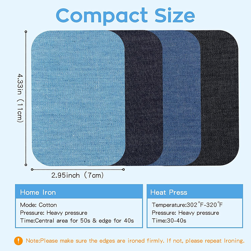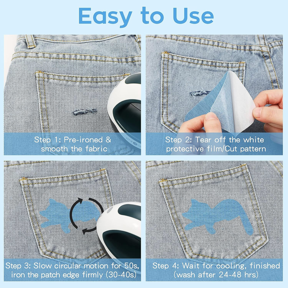 【GREAT STICKINESS & DURABLE】: Our iron on patches is soft and made of cotton. 30% more glue than other iron on patches for clothing, which could be machine washed and makes it through multiple washes, still remains its strongness and durability. Perfectly merged with your restored items without any falling off and fading after washing. 【NO RESIDUE & BAD SMELL】 Using a scissors to cut the size or shape you need to repair. Place the jean patches for clothing on the garment with iron for heavy pressure or heat press for middle presure. Only few minutes will take for inside & outside reinforced. Simply reironed the corners to make the iron on patch firm and no residue left. 【WIDE APPLICATIONS】 Iron on jean patches are ideal for the weak spot on the garments as well create different dress styles. Iron on patches for clothing repair can not only be applied on clothes, but also t-shirts, hats, shoes, socks and so on. Restoring the holes or worn out could prolong the life of the clothes and make you look more unique. 【DIMENSIONS & COLORS】Our size of denim patches inside jeans: 20 pack-3" by 4.25" will help to hide the shortcomings of both small and large holes and enough to create your own design. Iron on patches for jeans are able to almost perfectly match your clothes. The free sewing kit is included for ensuring the bond firm. 【EASY TO APPLY】You could use this patches for clothes to decorate, repair and reinforce the garments. The clothing patches could directly be cut into the shape and pattern you want. CAUTION: pay more attention on the edges avoiding curling when applying the jean patch. Please feel free to contact us if you are not 100% satisfied with patches iron on. Product Description HTVRONT 20 Pack Iron On Patches Free sewing kit we provided to help you makes the bond firm. Our iron on patches is made of highest quality fabrics,and the glue of our denim iron on patches are 30% more than others. You can design your personalized patterns, cut the jean patches into the shapes you want to patch or decorate your clothes to make your clothes unique. Pre-ironed and smooth Tear off the protective film Iron the patch firmly Wait for cooling 1 High Quality Fabric 2 Free Sewing Kit 3 Great Stickiness 4 Machine Washable Multiple products for you to choose from Add to Cart Add to Cart Add to Cart Add to Cart Add to Cart Add to Cart Add to Cart Customer Reviews 4.3 out of 5 stars 19,822 4.4 out of 5 stars 2,559 4.4 out of 5 stars 1,328 4.1 out of 5 stars 442 4.7 out of 5 stars 5,395 4.7 out of 5 stars 5,395 4.4 out of 5 stars 2,559 Price $5.99 $ 5 . 99 $7.29 $ 7 . 29 $7.99 $ 7 . 99 $7.99 $ 7 . 99 $34.99 $ 34 . 99 $34.99 $ 34 . 99 $13.69 $ 13 . 69 CATEGORY Iron on patches Iron on patches Iron on patches Iron on patches Small Heat Press Machine Heat Press Machine Iron on Patches COLOR Four colors Multi-color Rainbow color Four colors Mint Green Mint Green Four colors SIZE 20pack Cotton-3"x4-1/4" 20pack Cotton-3.7"x4.9" 20pack Cotton-3.7"x4.9" 4rolls Cotton-4x20" 93 / 100 4.34" x 4.13" 23 10" x 10" 3" x 60" APPLY TO Clothes,trousers,bags,jean, Clothes,trousers,bags,jean, Clothes,trousers,bags,jean, Clothes,trousers,bags,jean, For heat transfer materials For heat transfer materials Clothes,trousers,bags,jean, ADVANTAGE Easy to Apply Easy to Apply Easy to Apply Easy to Apply Safe Use Safe Use Easy to Apply