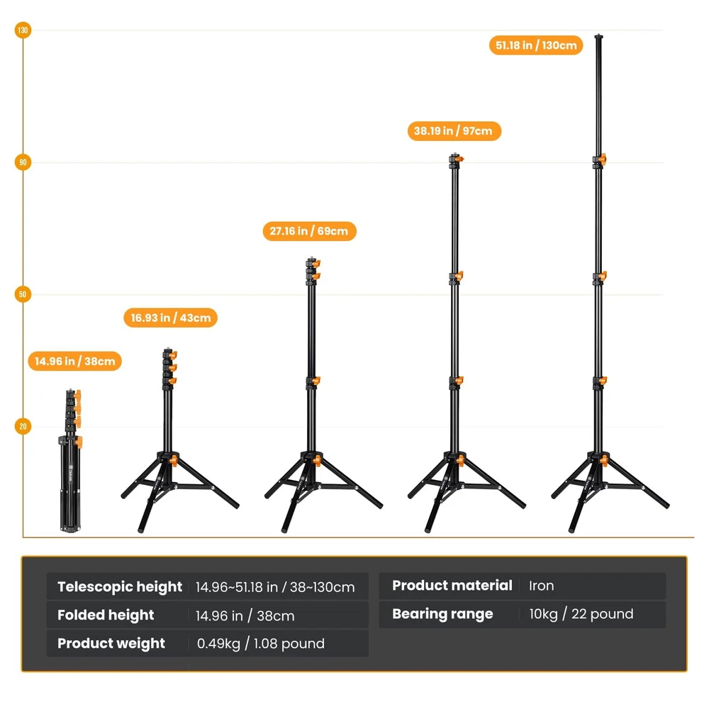 light stand tripod cell tripod photography arm iphone mount heavy duty boom stand stick mobile stand travel lightweight tripod portable Lightweight and Portable: Weighing only 1.08lb and folding down to a compact 15 inches, the lightweight light stand is effortless to carry and set up, making it perfect for on-the-go shooting and quick lighting adjustments. Robust Load Capacity: With a high load capacity of 22lb, the iron legs of the portable light stand are engineered with a sturdy support structure, allowing for versatile angle adjustments and reliable stability even when handling heavy equipment. Adjustable Height: This adjustable light stand can expand from 15 to 51.2 inches with 4 telescopic sections, easily lock the desired height using the knob for secure adjustments. The bottom knob structure ensures a firm and stable setup, catering to various shooting scenarios, especially ideal for outdoor use, travel, live stream and video recording. Universal 1/4 Interface: Versatile Compatibility: Equipped with a standard 1/4-inch interface, our light stand tripod is universally with a wide range of devices, including ring lights, mounts, cameras, reflectors, and more. Versatile and Portable Solution: The perfect balance of lightweight design, sturdy construction, and easy height adjustment makes this compact light stand an indispensable tool for content creators, photographers, vloggers, and anyone in need of reliable and portable lighting stand support.