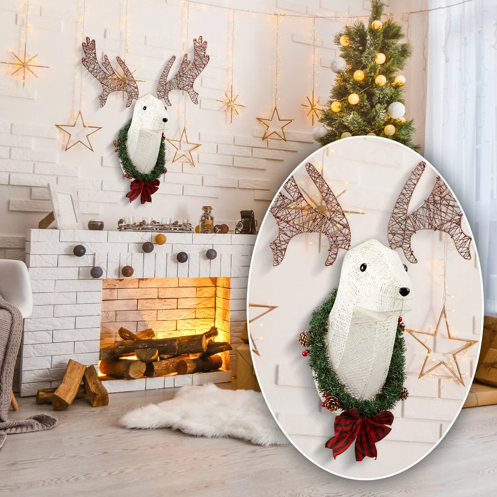 Introductions: Add a festive to your home this holiday season with our stunning Lighted Christmas Wall Decor Reindeer Head. Designed to bring warmth and cheer to any space, this glowing decoration effortlessly enhances both indoor and outdoor settings. Its pre-lit design creates a magical ambiance that brightens up your walls, doors, or windows, making your home the centerpiece of holiday celebrations. Easy to set up and built to withstand winter weather, this versatile decoration is perfect for spreading joy and holiday spirit wherever you it. Features: 1. Charming 3D Reindeer Design: This festive reindeer head wall decor is designed with a beautifully detailed 3D Rudolph, complete with a wreath, pinecones, and a red plaid bowknot. The vibrant and design makes it a standout piece for your Christmas decorations, perfect for adding a of festive magic to any space. 2. Eye-catching Lights: Pre-lit with 70 well-placed lights, the reindeer wall decor radiates a soft, warm white that illuminates your space beautifully at night. The lights bring the decor to life, making your home the highlight of the neighborhood during the holidays. 3. Easy Assembly: This collapsible Xmas decor can be set up in minutes, allowing you to enjoy your festive display without hassle. The lights are pre-installed, simply connect the wires and plug them in to watch the reindeer come to life. 4. Weather-Resistant and Sturdy Build: Made from a durable, rustproof metal frame, this reindeer head decor is built to withstand wind, rain, and snow. Double-coated glitter finish ensures-lasting without the worry of glitter flaking off. 5. Perfect Holiday Decor for Indoor & Outdoor: Whether you it on your front door, window, porch, yard, or living room wall, this lighted reindeer head enhances any space with festive warmth. Its lightweight design makes it easy to move and position them wherever you want to spread holiday cheer. Specifications: 1. Overall Dimensions: (11.4 x 10.6 x 39) in / (29 x 27 x 99) cm 2. Number of Lights: 70 pcs 3. Light Color: Warm White Package Includes: 1 x Reindeer Head Christmas Lighted Decoration