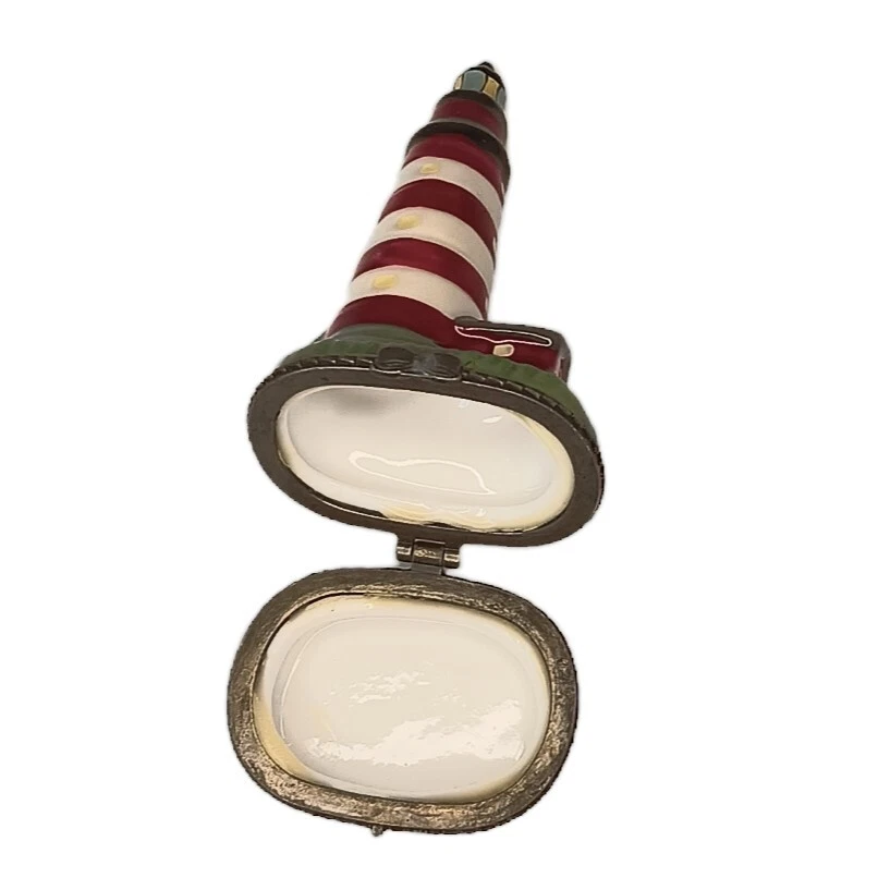Vintage Porcelain Hinged Lighthouse Trinket Box Red, White and Green Approximately 3.5" x 1.5" x 1" Weighs approximately 1.5 ounces Excellent condition