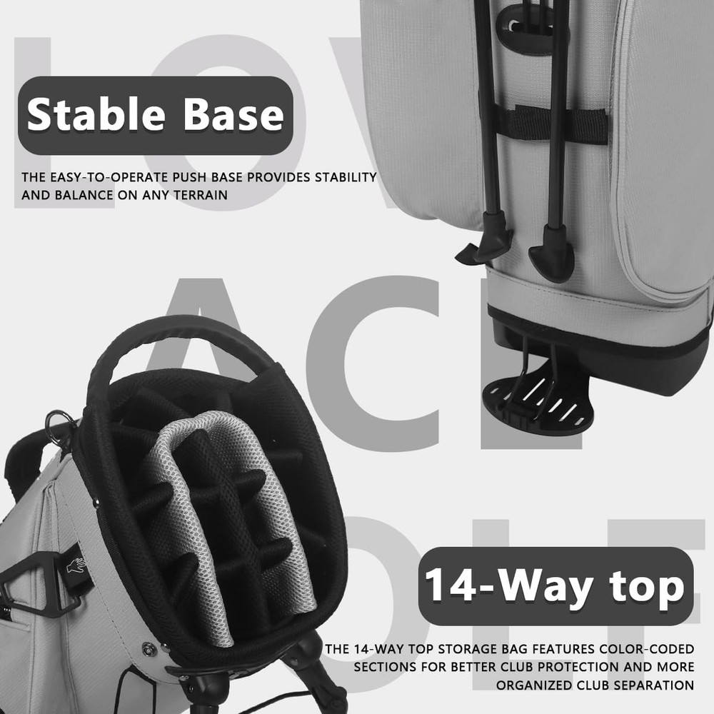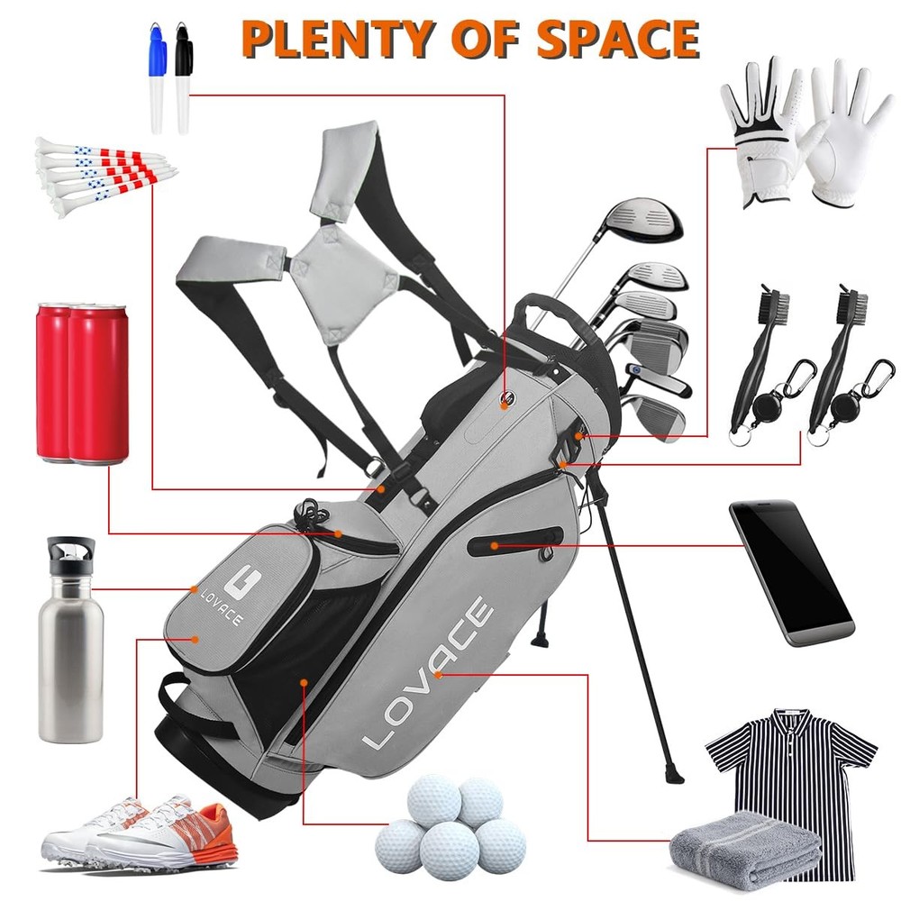 The LOVACE Stand Bag features quality construction and design targeted to golfers at all stages. 14-Way Top Divider System: Our golf stand bag features a 14-way top divider system that keeps your clubs neatly organized and easy to access. Each club has its own dedicated space, preventing damage from rubbing and ensuring quick retrieval during your game Lightweight and Easy to Carry: The golf stand bag is designed with a lightweight structure, making it easy to carry around the course. The padded, ergonomic shoulder straps ensure maximum comfort, allowing golfers to enjoy a full day on the green without strain Generous Storage with Multiple Pockets: With a variety of strategically placed pockets, including a cooler pocket for beverages, this golf bag offers ample storage for your golfing essentials. You’ll find plenty of room for balls, tees, gloves, and other accessories, ensuring everything stays in its place during your round Stable and Convenient Design: The golf club bag is designed to stand firmly on its own even without the stand deployed. This ensures that your bag stays balanced and easily accessible, allowing you to quickly grab your clubs and continue your game without hassle Built to Last: Made from high-strength nylon, the LOVACE 14-Way golf stand bag is designed to withstand the wear and tear of frequent use. Waterproof materials ensure your clubs and accessories stay dry and protected, no matter what the weather