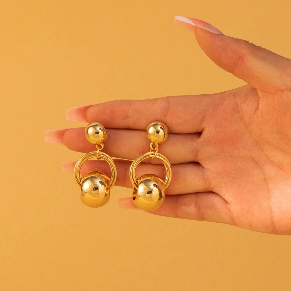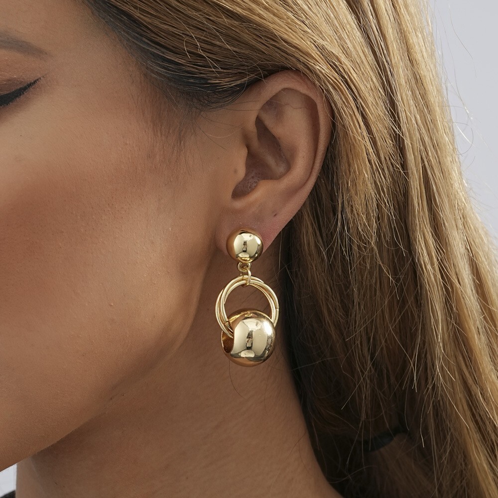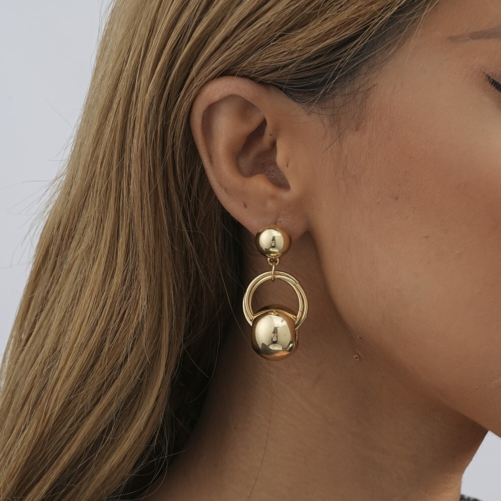 Add a touch of elegance to your outfit with these stunning Big Round Ball Gold Hoop Drop Dangle Earrings in Gold Plated Light Weight Stud. Designed for women, these earrings are 1.5 inches long and 0.75 inches wide, with a flush setting style and a stud pierced closure. Perfect for any occasion, whether it's for an engagement, wedding, birthday, or simply a night out with your friends or loved ones. These earrings are made of alloy (Gold Plated) and feature a beautiful gold plated color, making them ideal for a variety of outfits. The earrings are also nickel-free. With a range of themes to choose from such as Beauty, Art, and Love, these earrings are perfect for expressing your unique style and personality. Whether it's for yourself or as a gift for someone special, these Big Round Ball Gold Hoop Drop Dangle Earrings are a must-have in any jewelry collection. (V)