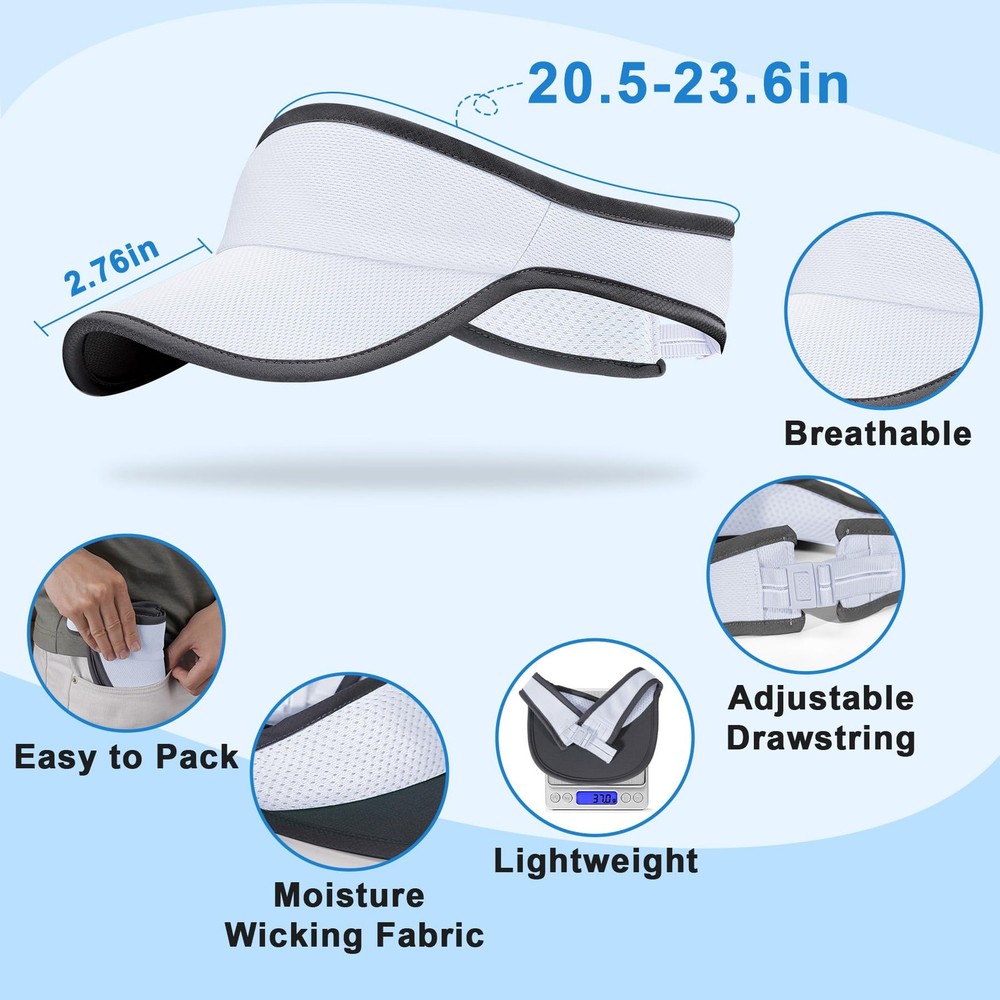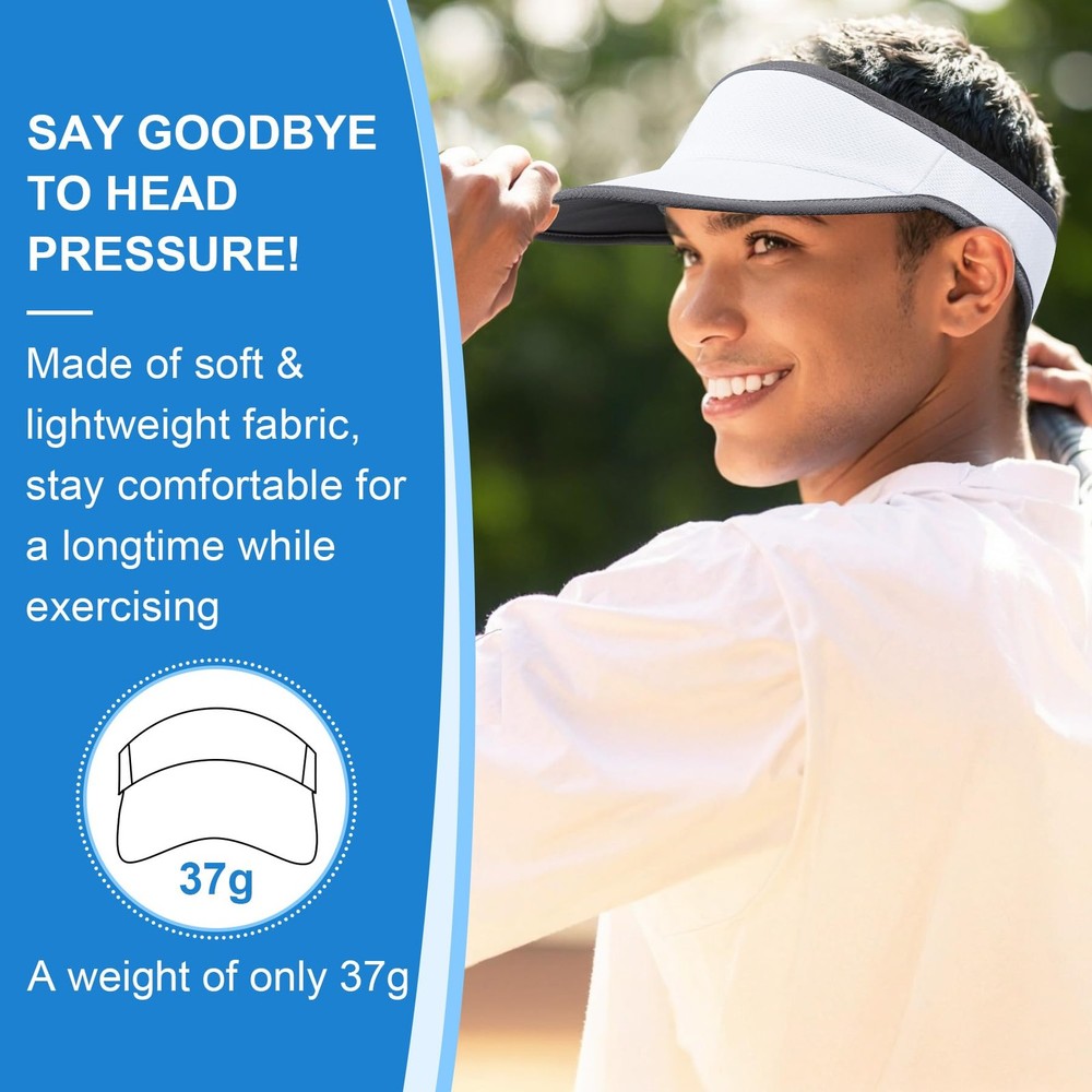 Lightweight Sports Sun Visor – Stay Cool, Stay Protected Meet your new go-to companion for outdoor adventures. Crafted for ultimate comfort, this sun visor weighs just 37 grams—lighter than a golf ball! Slip it on and forget it’s there, whether you’re crushing a 10K run or perfecting your tennis serve. Why You’ll Love It: All-Day Sun Defense: The extended 2.76-inch brim shields your face and eyes from harsh sunlight, while the sun protection fabric blocks harmful rays during hiking, biking, running, tennis or golf. No Sweat Interference: A soft inner sweatband pulls moisture away fast, keeping you dry even in summer heat. Dries 40% quicker than regular hats—no more soggy forehead during workouts. Shape It Your Way: Bend the flexible brim to block glare on the golf course, flatten it for a sleek look on runs, or curl it to hold sunglasses snugly. It springs back perfectly, even after being stuffed in a backpack. Breathable & Adjustable: Mesh panels let airflow cool your head, while the stretchy elastic strap fits most sizes (20.5”–23.6”). No slipping, no squeezing—just a secure, comfortable feel. Throw it in your gym bag, clip it to a hiking pack, or fold it into your pocket. Ready for any sport, any weather, any adventure. Lightweight Sun Visor Weighs Only 37g: Lighter than 1 golf ball! This visor provides long-lasting comfort without any head pressure. Packable design folds into your pocket or gym bag instantly. Zero bulk during marathons or pickleball matches Sun Protection for Outdoor Activities: Advanced sun protection fabric blocks most UV rays, this Sports Sun Visor is perfect for running, cycling, tennis & golf. Extended 2.76" brim shields eyes without restricting vision Quick-Dry Sweatband for High-Intensity Sports: Built-in sweatband pulls sweat away in short time, dries 40% faster than cotton hats. Keep you cool and dry even during intense workouts or hot summer days Moldable Brim Design: Reinforced yet flexible brim holds any shape—curve it for golf glare blocking or flatten for running aerodynamics. Regains form after crushing in bags Adjustable Fit & Breathable: Designed with a adjustable elastic strap, this Sun Visor for Men Women fits heads 20.5"-23.6". Mesh vents reduce heat, allowing for better airflow and ventilation