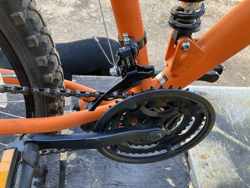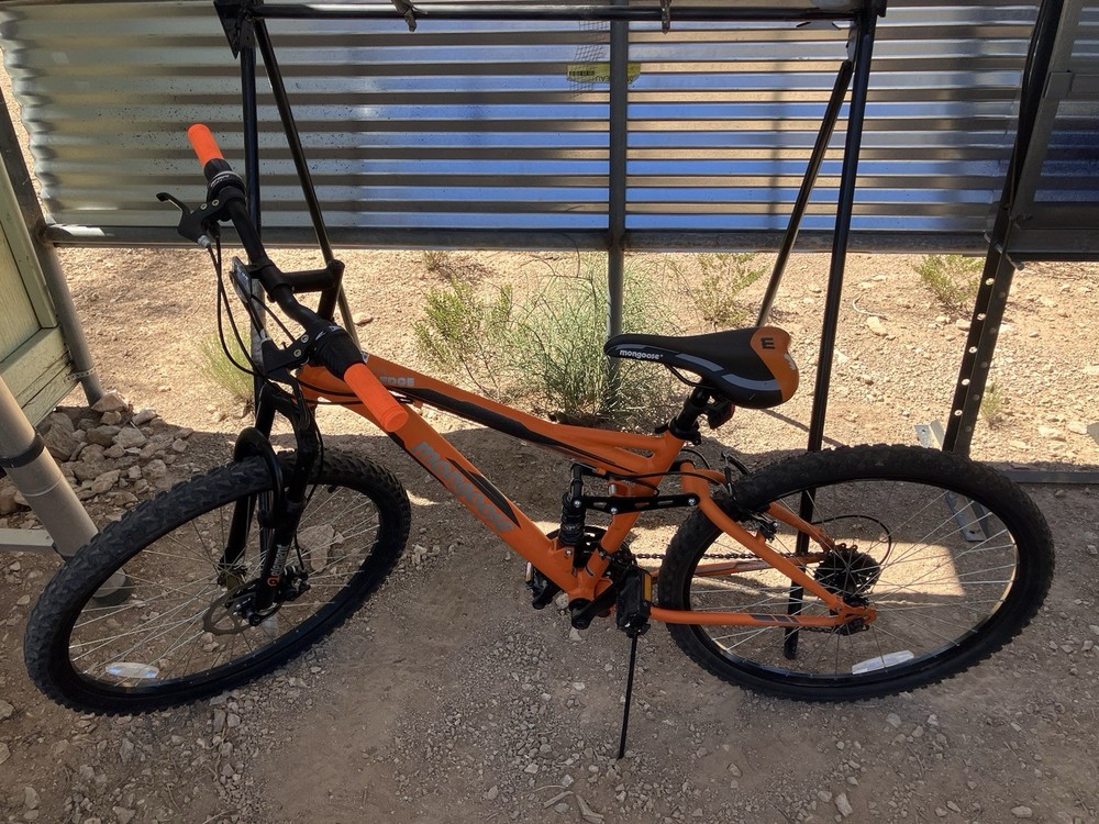 The Mongoose Ledge 2 mountain bike features a flat handlebar, 26-inch tubular tires, and a lightweight aluminum frame. With 21 speeds and full suspension, this orange bike is designed for off-road adventures. Equipped with disc brakes and a twist shifter, it offers smooth and reliable gear changes. Perfect for both male and female riders, this medium-sized bicycle is ideal for tackling rugged terrains with confidence and style.