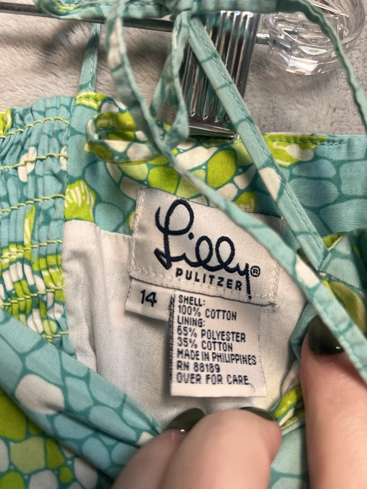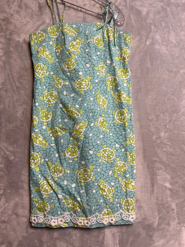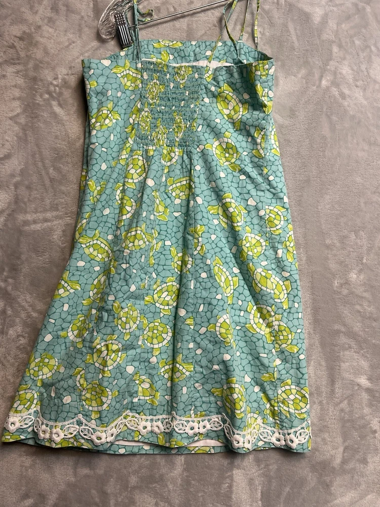 Features: Straps Closure: Tie Material: 100% Cotton Size Type: Regular Department: Women Color: Blue, Green and White Style: Sundress Brand: Lilly Pulitzer Character: Lilli Dress Length: Short Size: 14 Accents: Strap Sleeve Length: Sleeveless Occasion: Casual Pattern: Mosaic Background with Sea Turtles