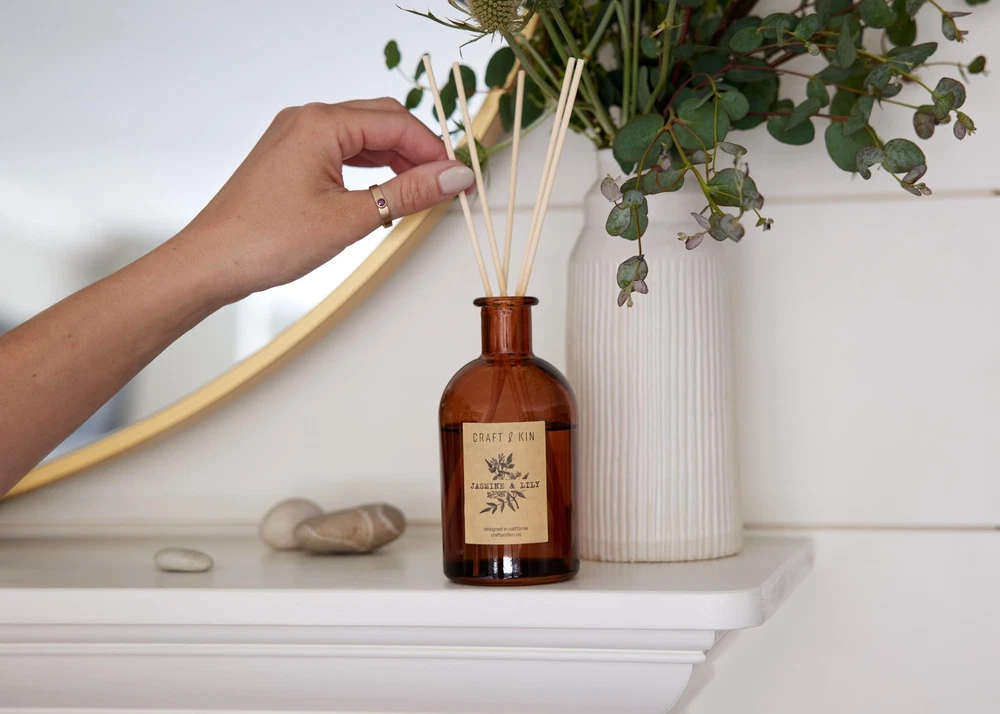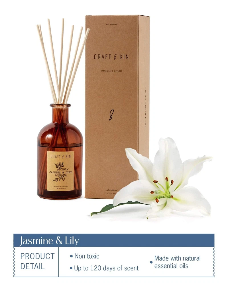 Crafted with precision and care, the collection is dedicated to enhancing your home environment by infusing it with the power of scent. Our Reed Diffuser Sets for Essential Oils offer both indulgence and functionality, serving as essential additions to your home essentials while making ideal gifts for new homeowners. With a remarkable 120-day scent duration and a design that complements any decor style, our amber glass jar encourages creative reuse, providing an eco-friendly touch to your space. Elevate your home's atmosphere with the Reed Diffuser Set, blending style, function, and sustainability seamlessly. Experience the soothing and therapeutic scent of our 'Jasmine & Lily Calming & Relaxing' reed diffuser set. Crafted to relieve stress and revitalize your senses, it creates a calming and relaxing ambience, perfect for greeting guests and creating a tranquil atmosphere. What You Get: Aromatic Reed Diffuser Set: Includes 8 rattan oil diffuser sticks, an elegant amber glass vase, and premium natural jasmine & lily essential oil mixture (5.75oz). Enjoy continuous fragrance for 90-120 days. All-Natural Essential Oil for a Great-Smelling Space: Our reed diffuser offers an all-natural and safe alternative to keep your space smelling great. The scented oil sticks provide a safe release of relaxing aromas, helping you create a stress-free environment. Effective Rattan Reed Diffuser Sticks for a Long-Lasting Scent: The rattan sticks in our set are designed to efficiently soak up the fragrance oil and disperse the scent into the air. The dark-colored amber vase preserves the essential oil by limiting light exposure, while the small opening helps mitigate oil evaporation. The Perfect Gift: This reed diffuser set is an excellent house-welcoming gift for any hostess and a delightful addition to any gift basket. The beautiful packaging and amber glass jar design make for an unforgettable experience every day.